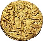 France. Tremissis, Avranches, Berulfus. Obv. ABRINKATAS (the 'S' facing down). Standing figure with radiate head holding spear, abrankatas. Rev. BERVLFVS. Cross. Prou –. AU. g. 1.34 mm. 13.00 RRRR. About EF. Merovingians. Francia. Prou –. AU. g. 1.34 mm. 13.00 RRRR. qSPL.