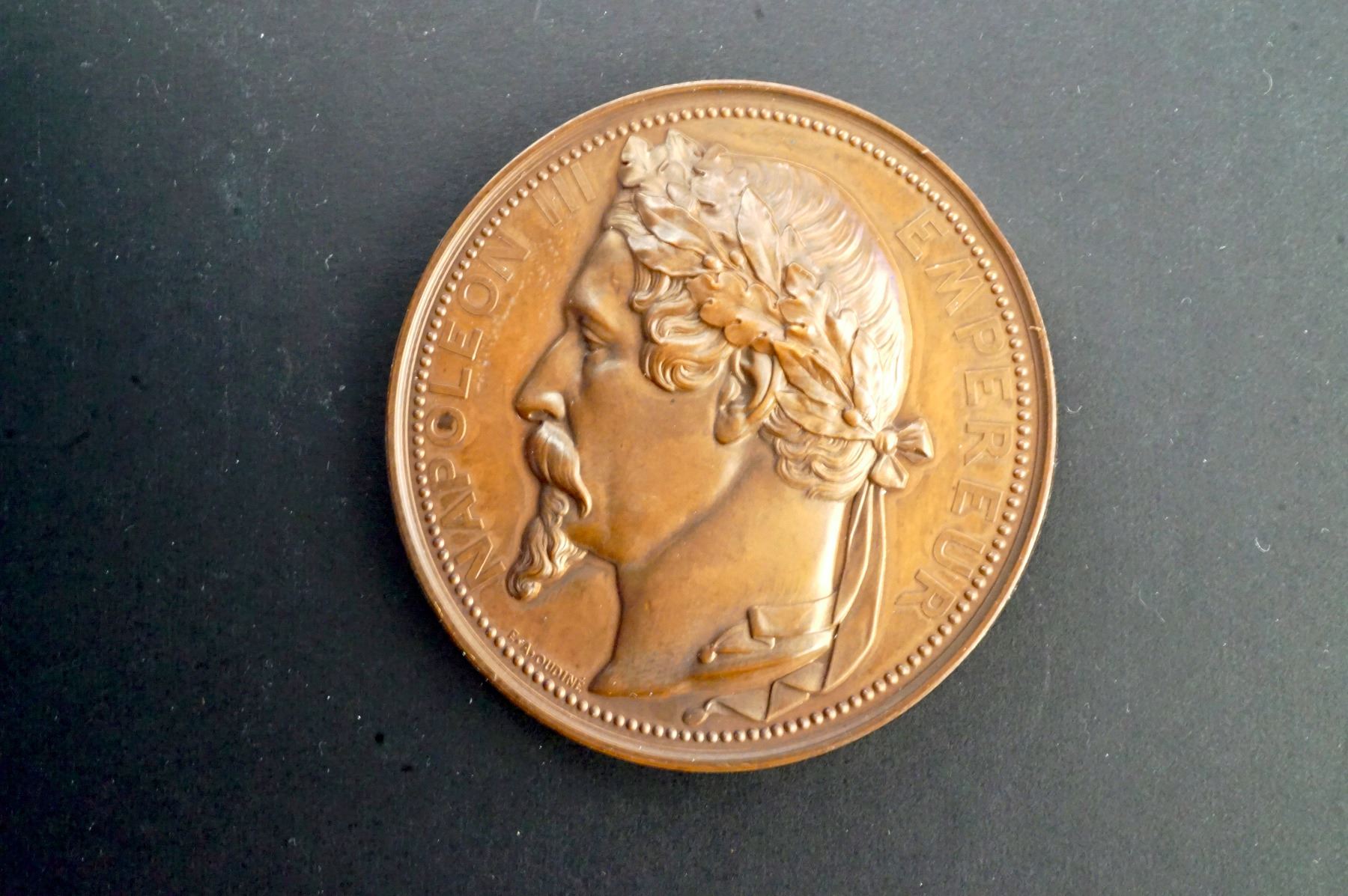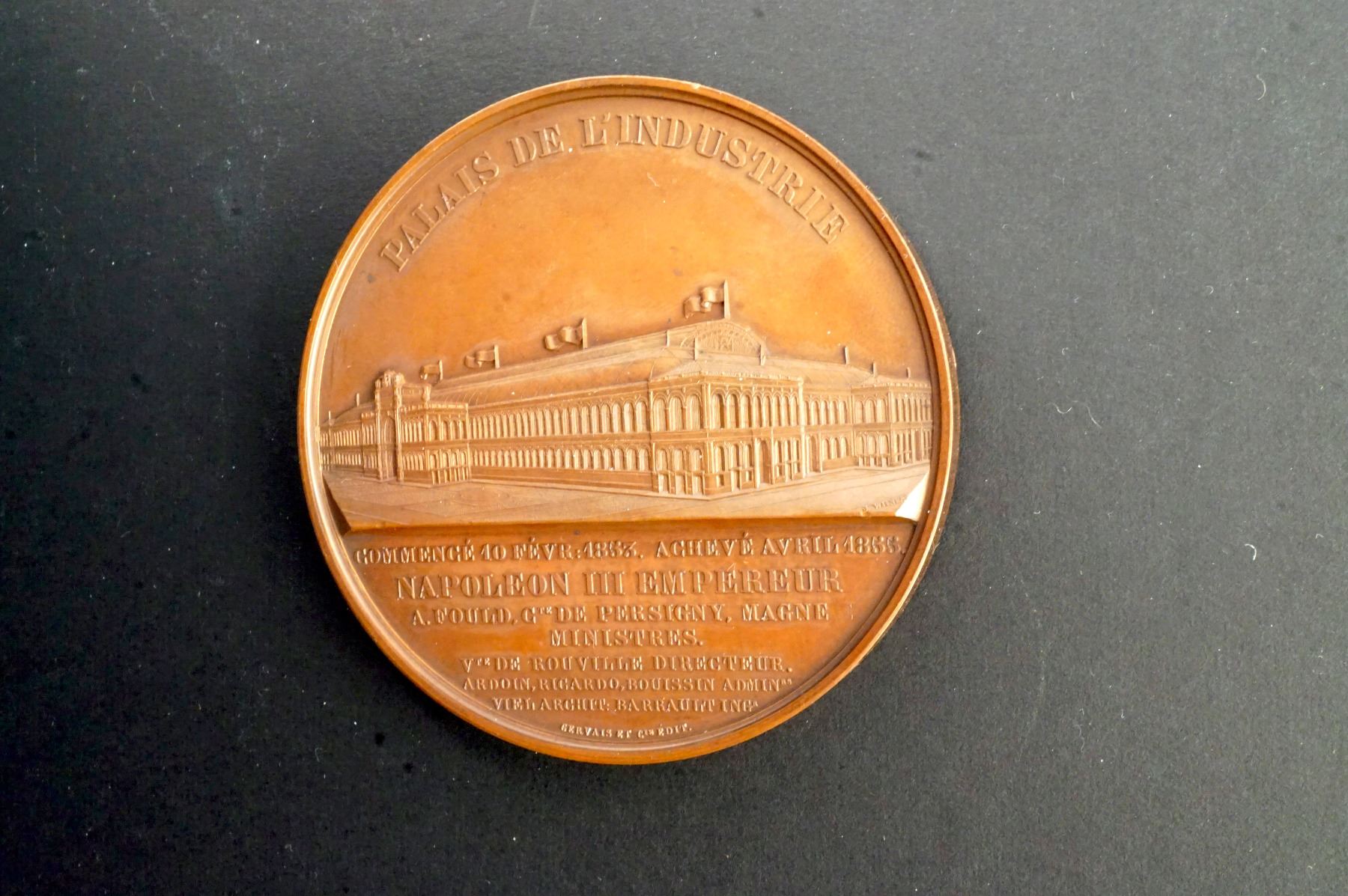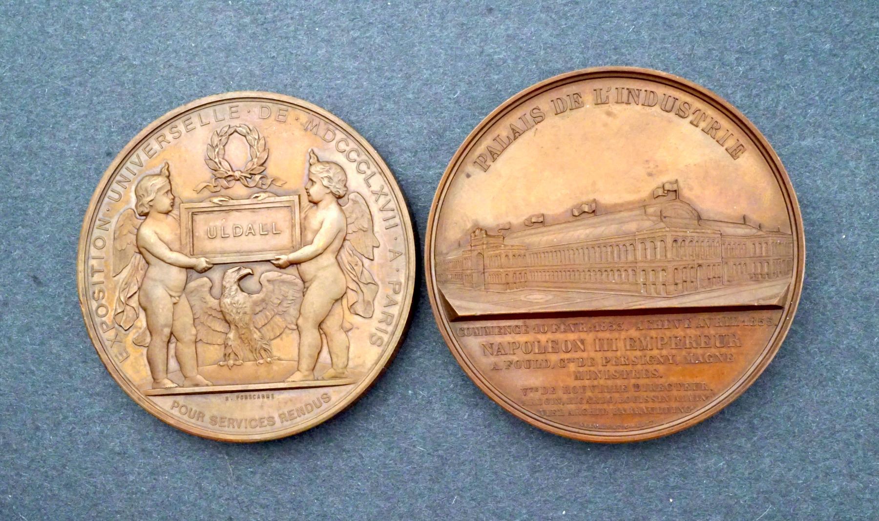 Both with the Paris Mint CUIVRE mark on the edge, so possibly restrikes. 1) 68, mm. 173.6 grams.NAPOLEON III EMPEROR High relief laureate bust, left. Signed: E. A. OUDINÉ Reverse: PALAIS DE LÍINDUSTRIE, below GERVAIS ET Cie, Édit. Ch. UNC. 2) 68 mm, 157.7 grams. Obverse: NAPOLEON III EMPEROR Laureate bust, left. Signed: H. PONSCARME F. Reverse: Universal Exposition of 1867. Two cupids holding a tablet inscribed: ULDALL, Above, a wreath, below, an eagle. Signed: POUR SERVICES RENDUS. Signed: H. PONSCARME