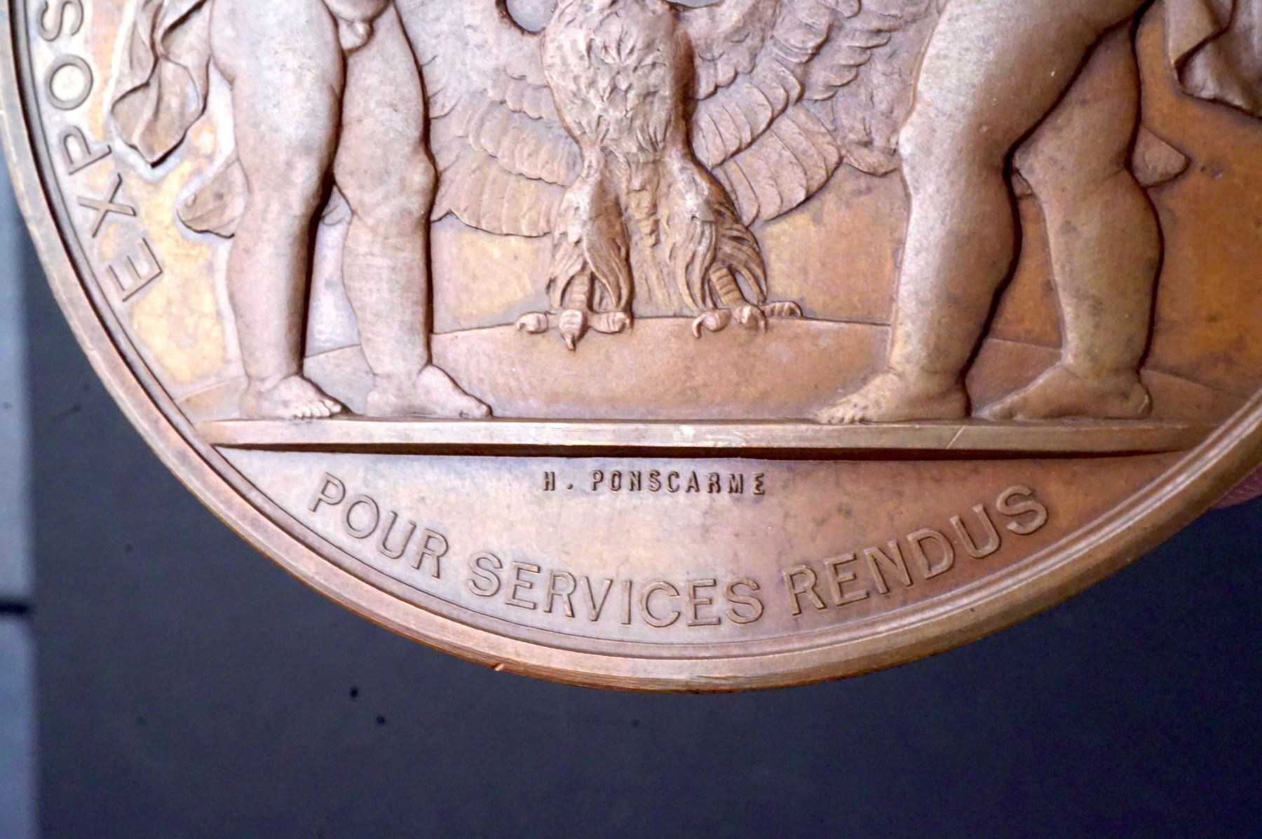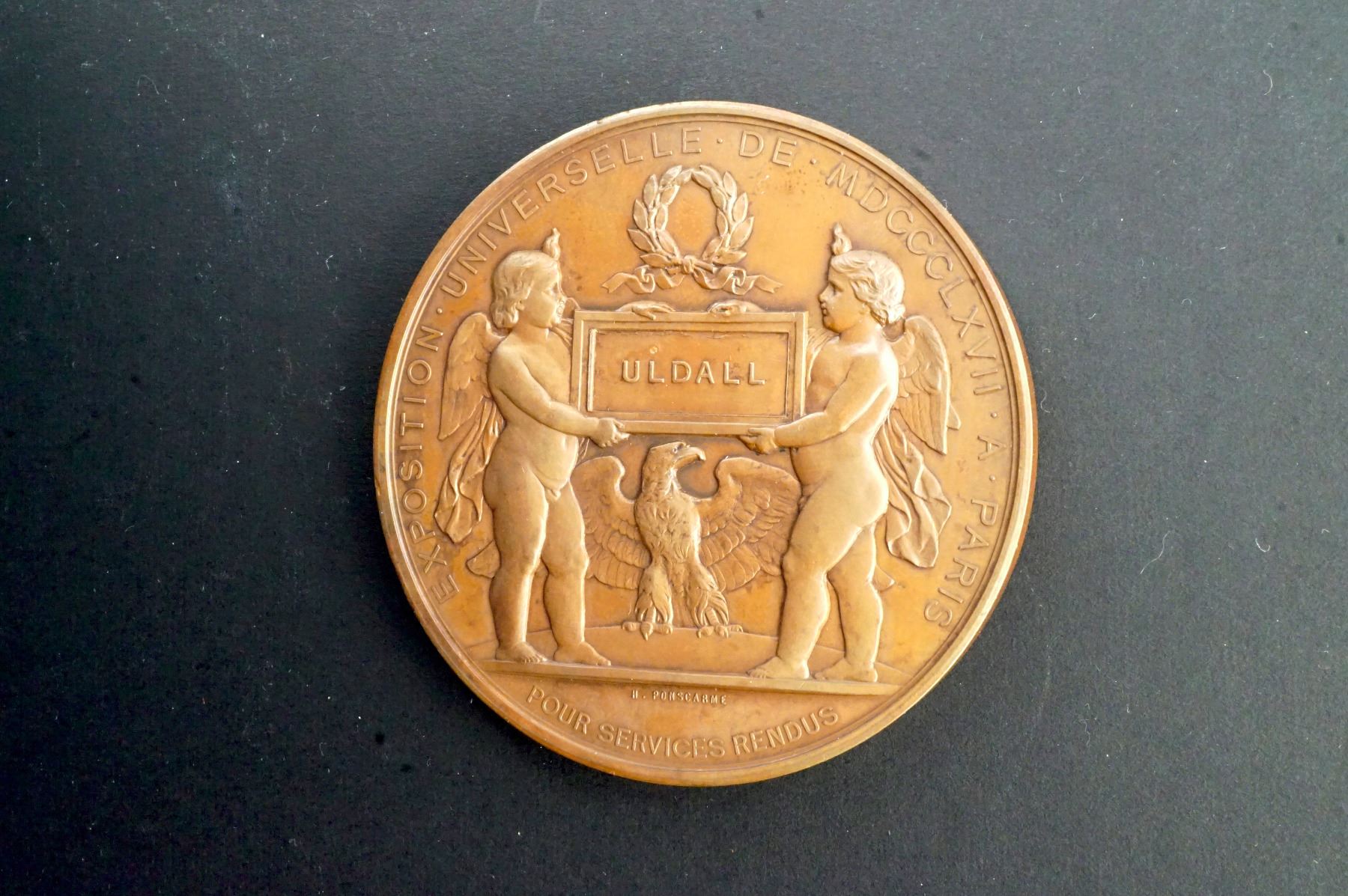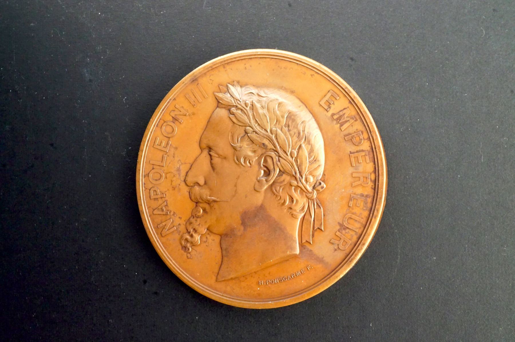 Both with the Paris Mint CUIVRE mark on the edge, so possibly restrikes. 1) 68, mm. 173.6 grams.NAPOLEON III EMPEROR High relief laureate bust, left. Signed: E. A. OUDINÉ Reverse: PALAIS DE LÍINDUSTRIE, below GERVAIS ET Cie, Édit. Ch. UNC. 2) 68 mm, 157.7 grams. Obverse: NAPOLEON III EMPEROR Laureate bust, left. Signed: H. PONSCARME F. Reverse: Universal Exposition of 1867. Two cupids holding a tablet inscribed: ULDALL, Above, a wreath, below, an eagle. Signed: POUR SERVICES RENDUS. Signed: H. PONSCARME