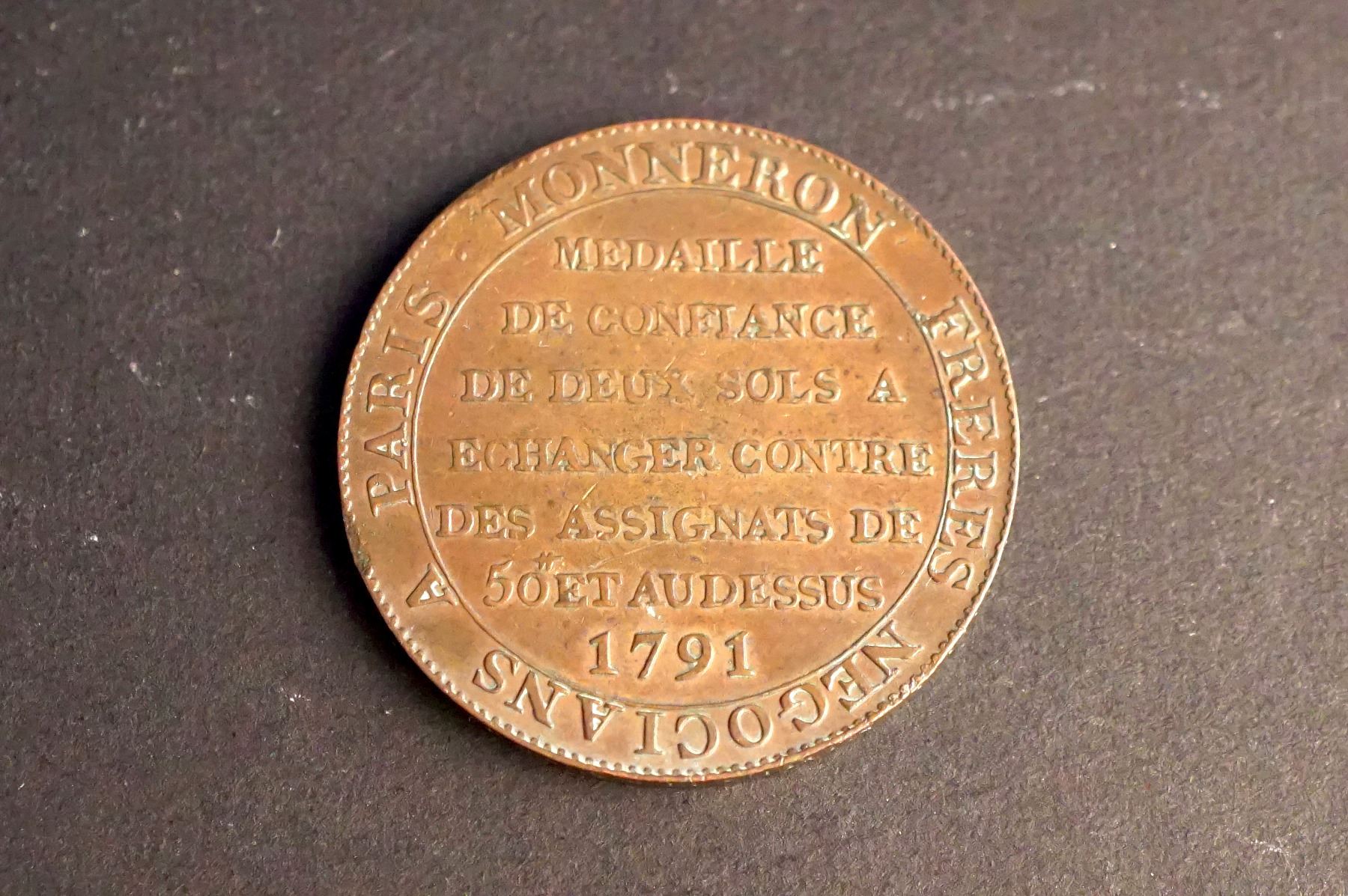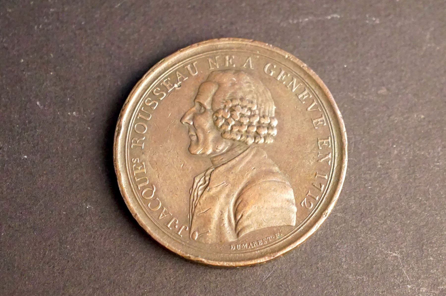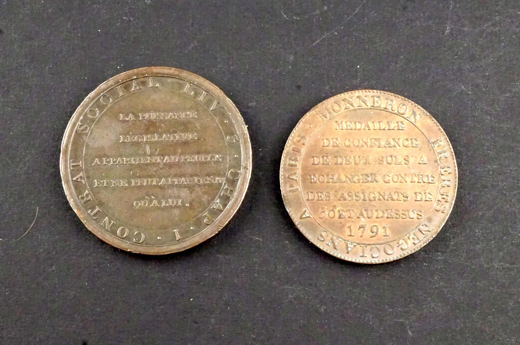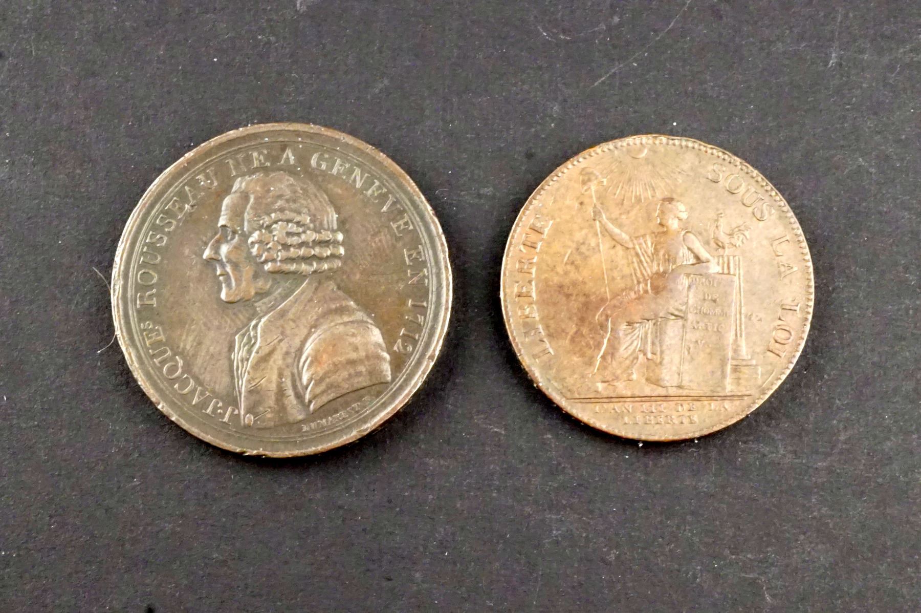 One is the 2 Sols Token of 1791, the other is a medal of J. Jacques Rousseau, undated, but probably of the same period. There was a suspension hook, removed. Copper, 34 mm, 24 grams. Obverse: J. JACQUES ROUSSEAU, NÉ À GENÈVEEN 1712. Bust, Left. Reverse: Text, edge: CHE (?) MONERON PATENTÉ SE VEND À PARIS