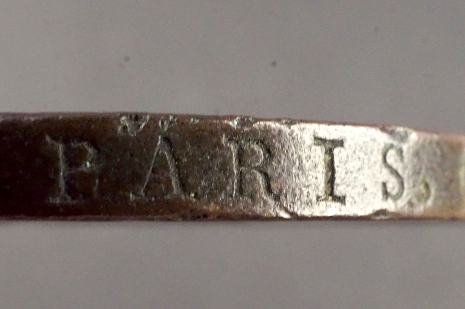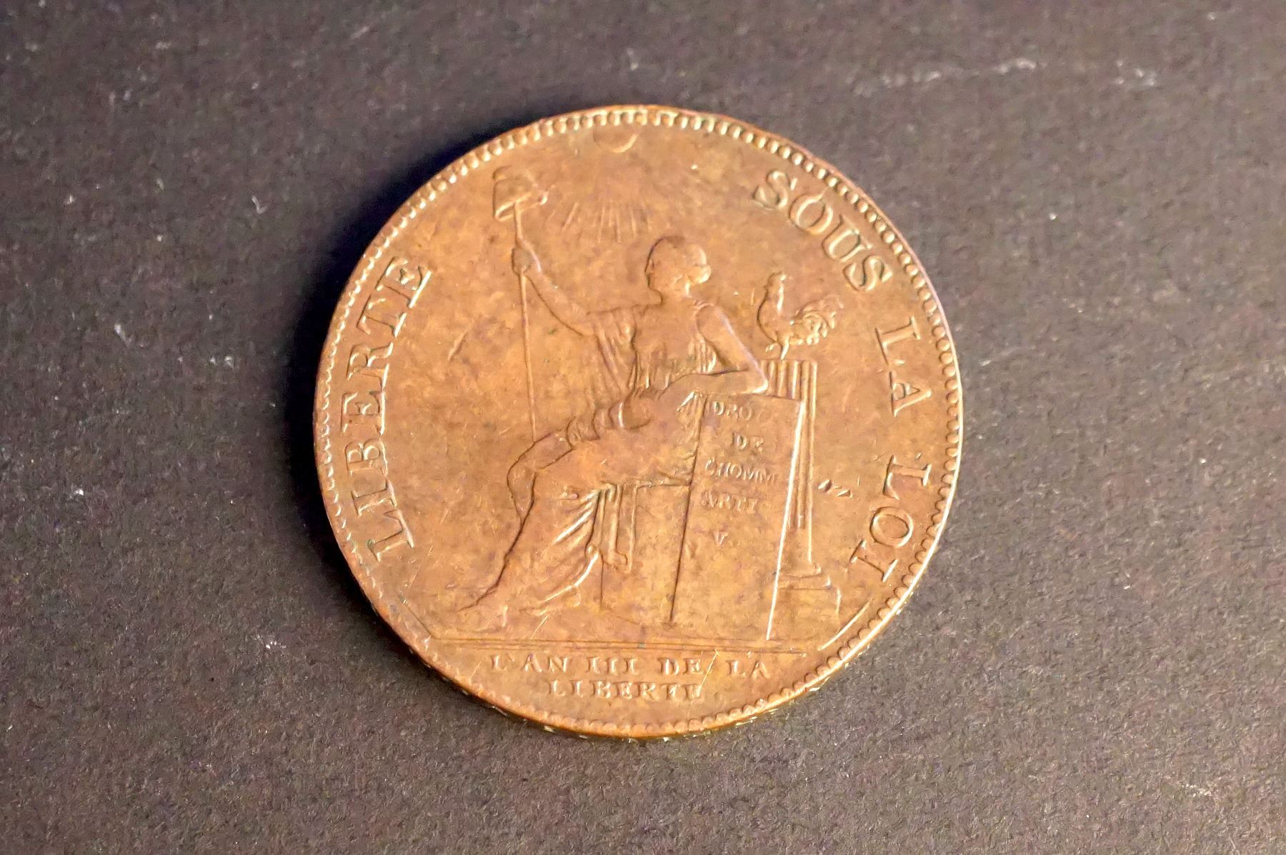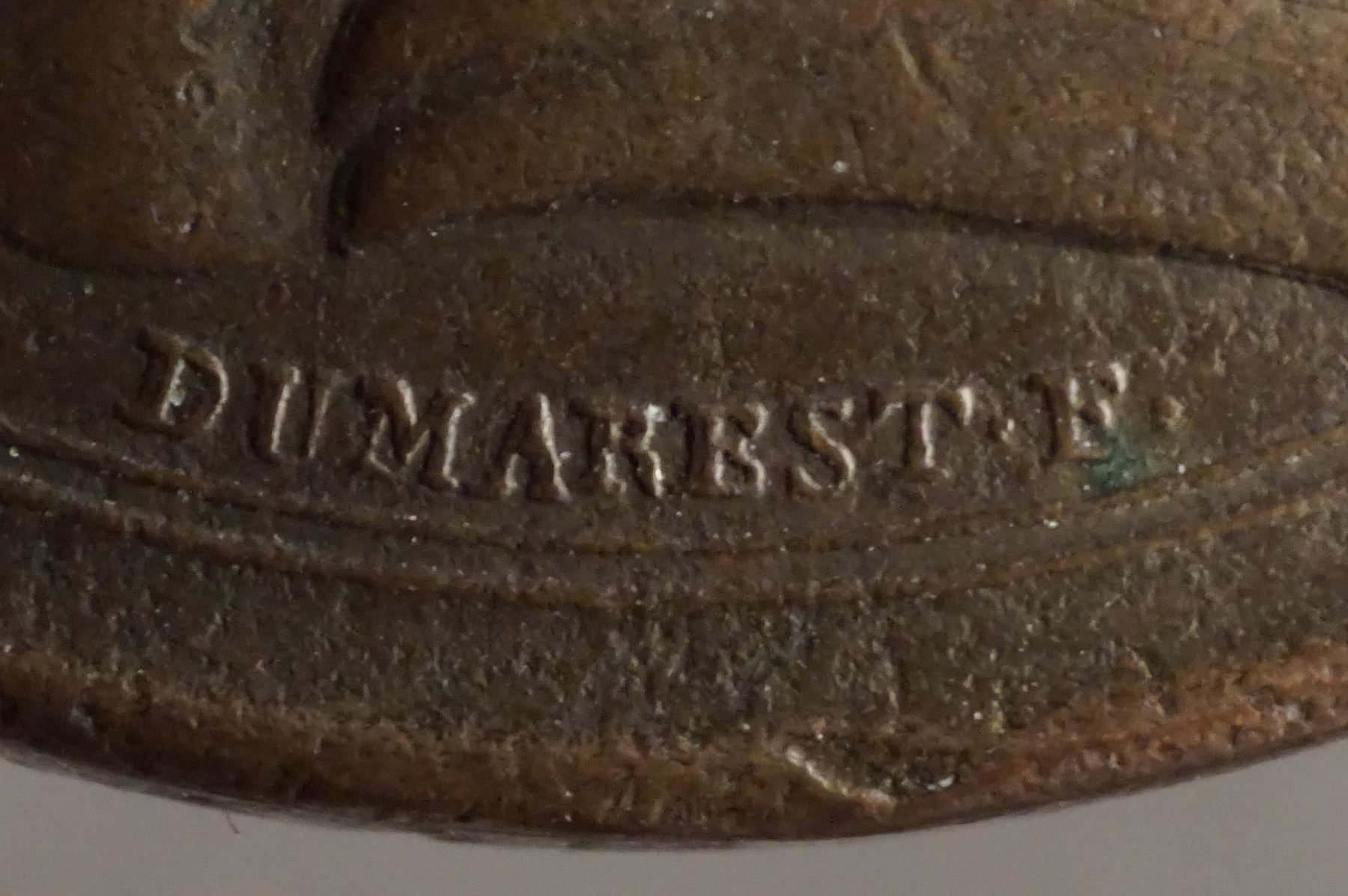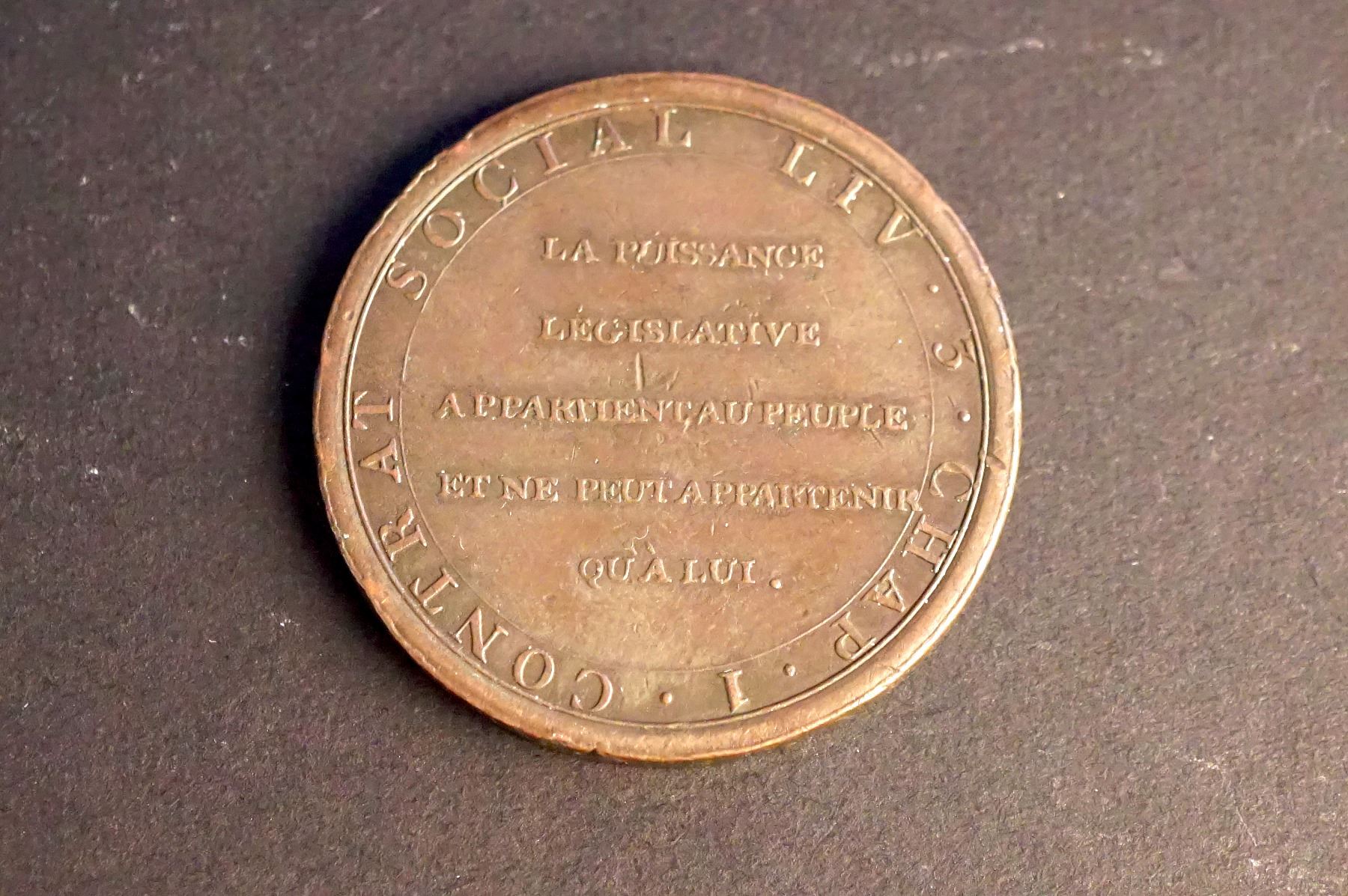 One is the 2 Sols Token of 1791, the other is a medal of J. Jacques Rousseau, undated, but probably of the same period. There was a suspension hook, removed. Copper, 34 mm, 24 grams. Obverse: J. JACQUES ROUSSEAU, NÉ À GENÈVEEN 1712. Bust, Left. Reverse: Text, edge: CHE (?) MONERON PATENTÉ SE VEND À PARIS