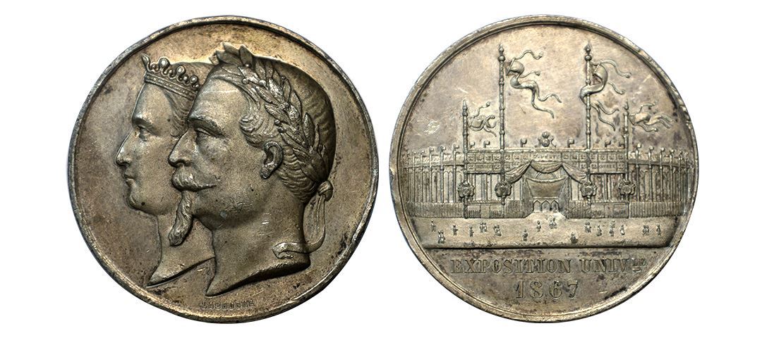 France, Universal Exposition of 1867, Commemerative Silver Medal, 46.17 gms, Paris Mint, Obv. Bustes attached to the left of Napoleon III and Eugenia, signature “LABOUCHE” below, extremely fine, rare