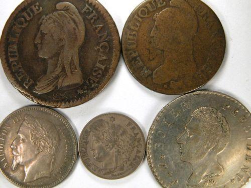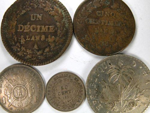 5 Centimes lAn 5 BB, Fine, 10 Centimes lAn 8 A, VF, 50 Centimes 1850A VF-EF and 1 Franc 1866A, EF. Plus Haiti 100 Centimes An 26, EF. Total five pieces
