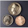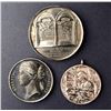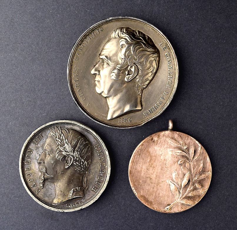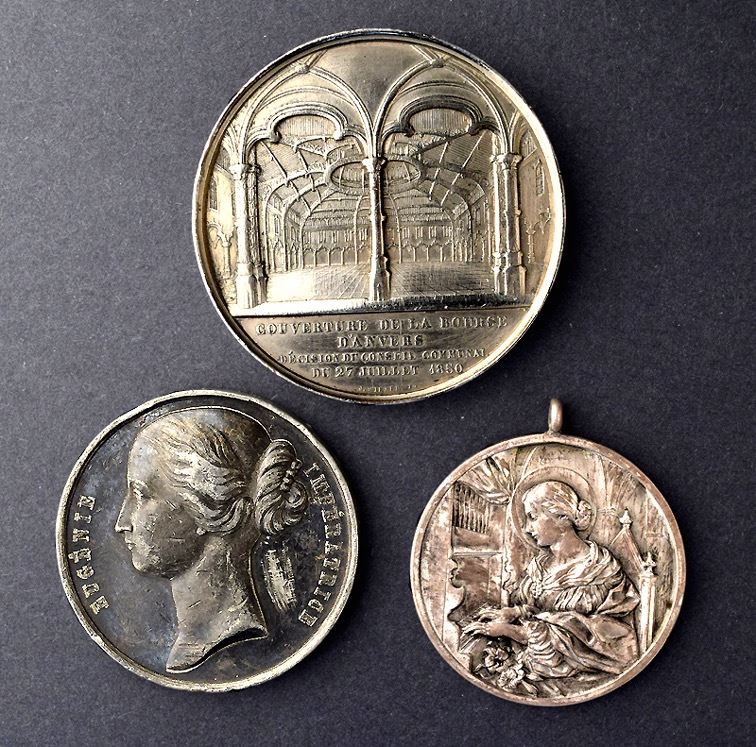 (1)- Charles Marcellis, Le Commerce D'Anvers, 1854, Opening of the Bourse of Anvers, 27 July, 1850. Ar, silver, 60mm, 95.50 gms, by Leopold Weiner/J.Weiner, F-VF, cleaned, edge bumps; (2)- Napoleon III Empereur; Impératrice Eugenie; Wm, 50mm, by Caque, VG; (3)- early 20th Century generic French medal, with saintly woman playing piano, unpresented. Wm, 45mm, VF; total 3 medals