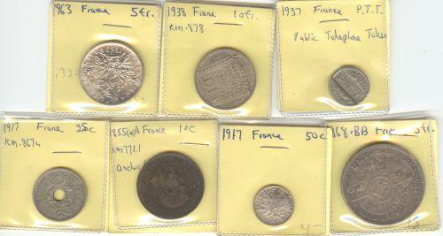 France 10 Centimes 1855A KM # 771.1, 25 Centimes 1917 KM # 867a, 50 Centimes 1917 KM # 854, 5 Francs 1868 BB KM # 799.2, 5 Francs 1963 KM # 926, 10 Francs 1938 KM # 878 & 1937 PTT (public telephone token).