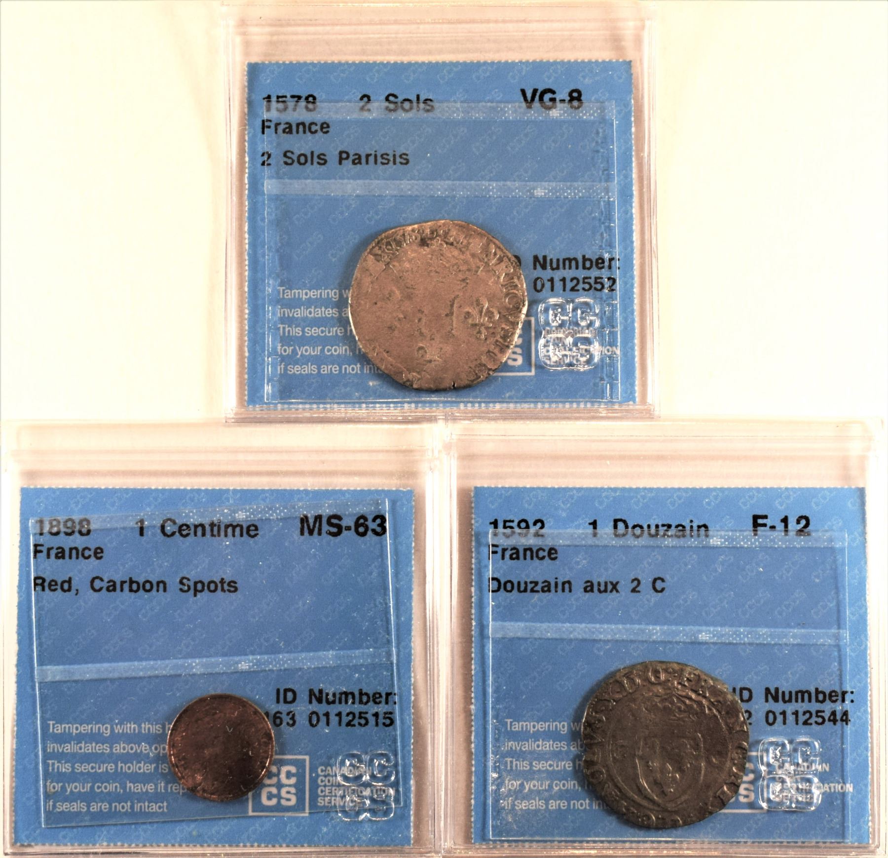 France, trio w/ 2 Sols Parisis 1578 in VG-8, 1 Douzain aux 2c 1592 F-12 (Off center Reverse) and 1Centime 1898 in MS-63 Red Carbon Spots all Certified CCCS (3)
