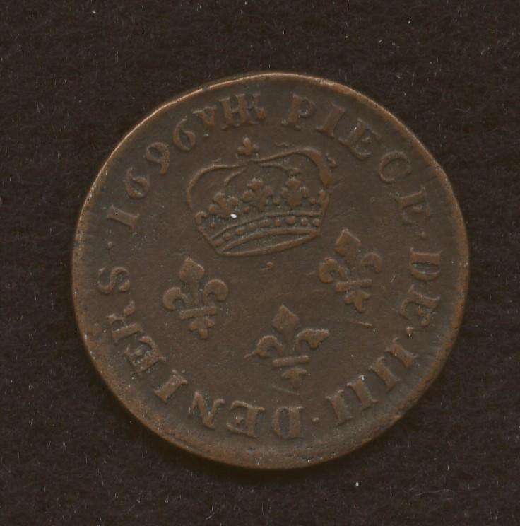 4 deniers, 1696, copper, ???use in Canada, Fine