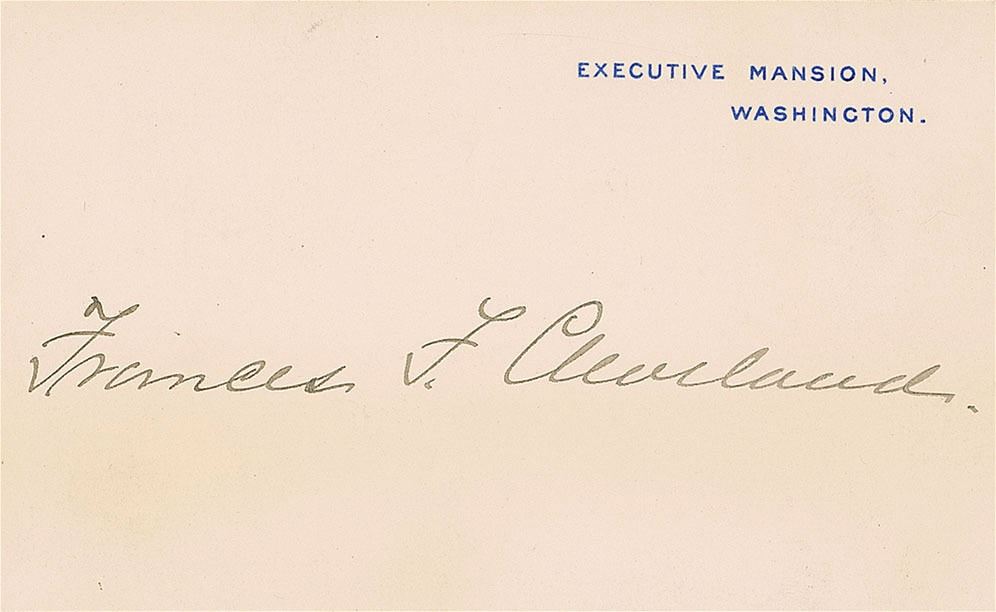Four items: an ALS signed “Frances F. Cleveland Preston,” one page both sides on a 5.75 x 3.25 card, March 10, 1930, apologizing for not returning a letter, accompanied by the original free franked mailing envelope bearing an affixed newspaper photo, 6 x 3.5, filled out in Cleveland’s hand and franked in the upper right, “Frances F. Cleveland Preston”; an Executive Mansion card signed neatly in black ink, “Frances F. Cleveland”; and an ink signature, “Grace Coolidge, November 6, 1947,” on an off-white 5.25 x 3.5 autograph sheet. In overall fine condition.