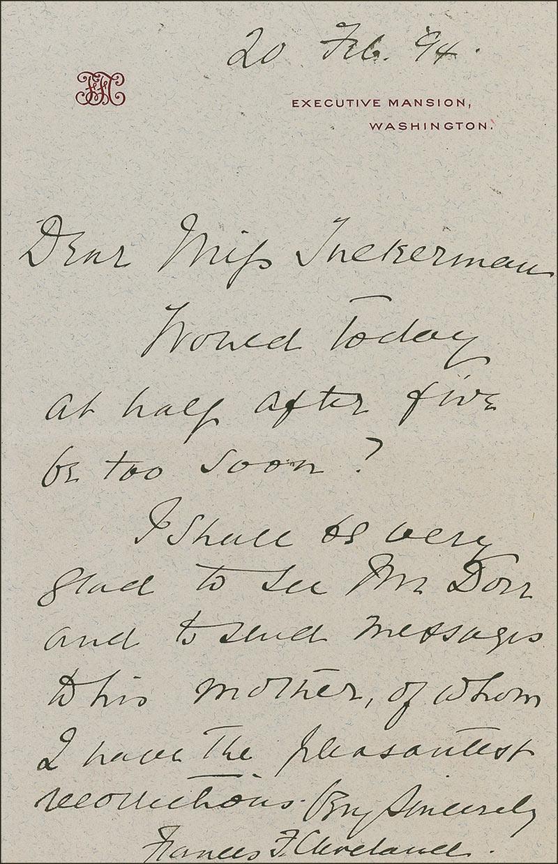 ALS, one page, 4 x 6, Executive Mansion letterhead, February 20, 1894. In full: “Would today at half after five be too soon? Shall be very glad to see Mr. Dorr and to send messages to his mother, of whom I have the pleasantest recollections.” In fine condition.