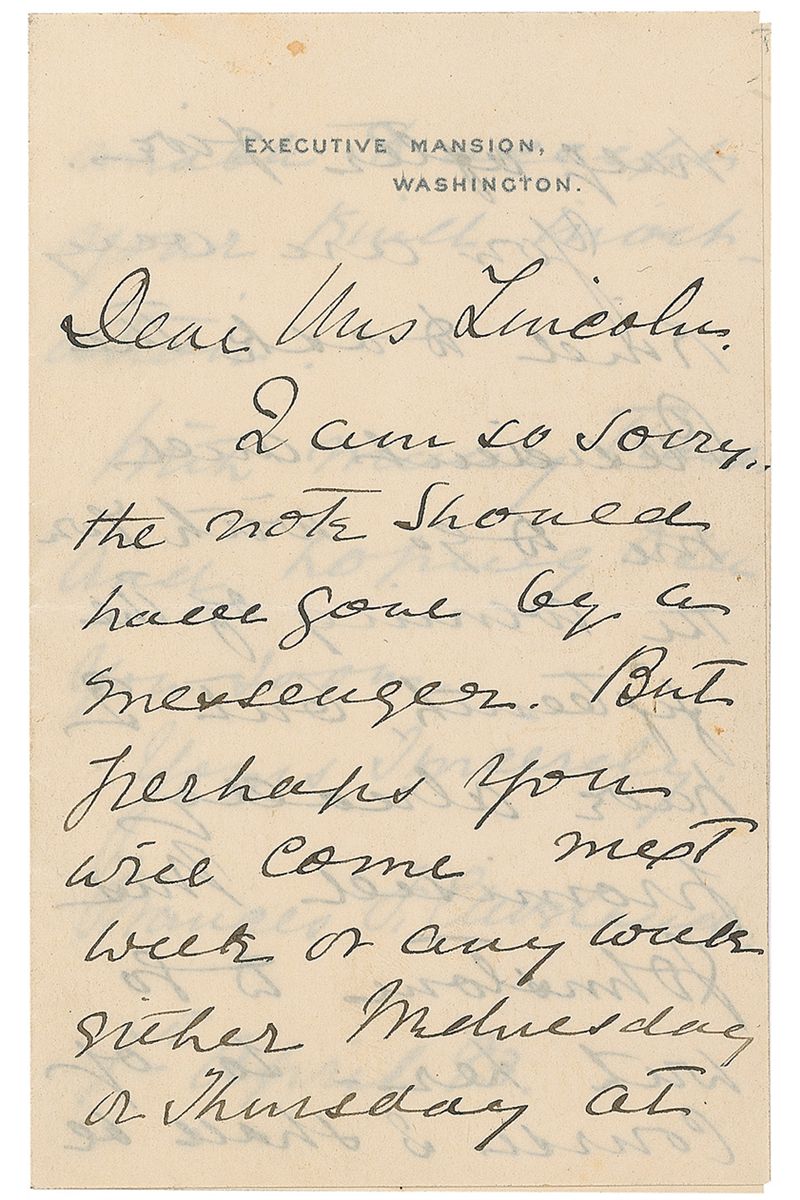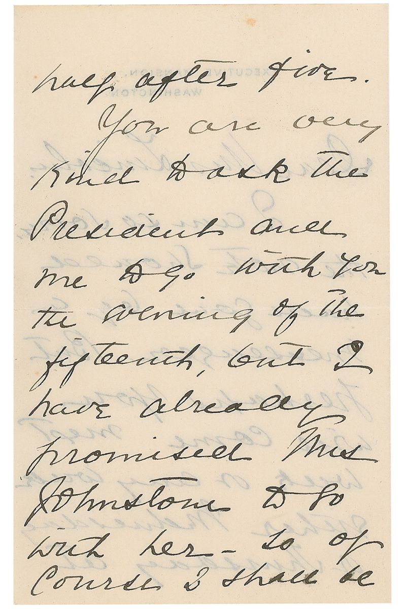 ALS signed “Frances F. Cleveland,” three pages on two adjoining sheets, 3.25 x 5.25, Executive Mansion letterhead, April 7, 1893. Letter to Mrs. Lincoln. In part: “I am so sorry the note should have gone by a messenger…You are very kind to ask the President and me to go with you the evening of the fifteenth, but I have already promised Mrs. Johnston to go with her—so of course I shall be unable to accept your kind invitation.” In fine condition, with a couple trivial spots to first page.