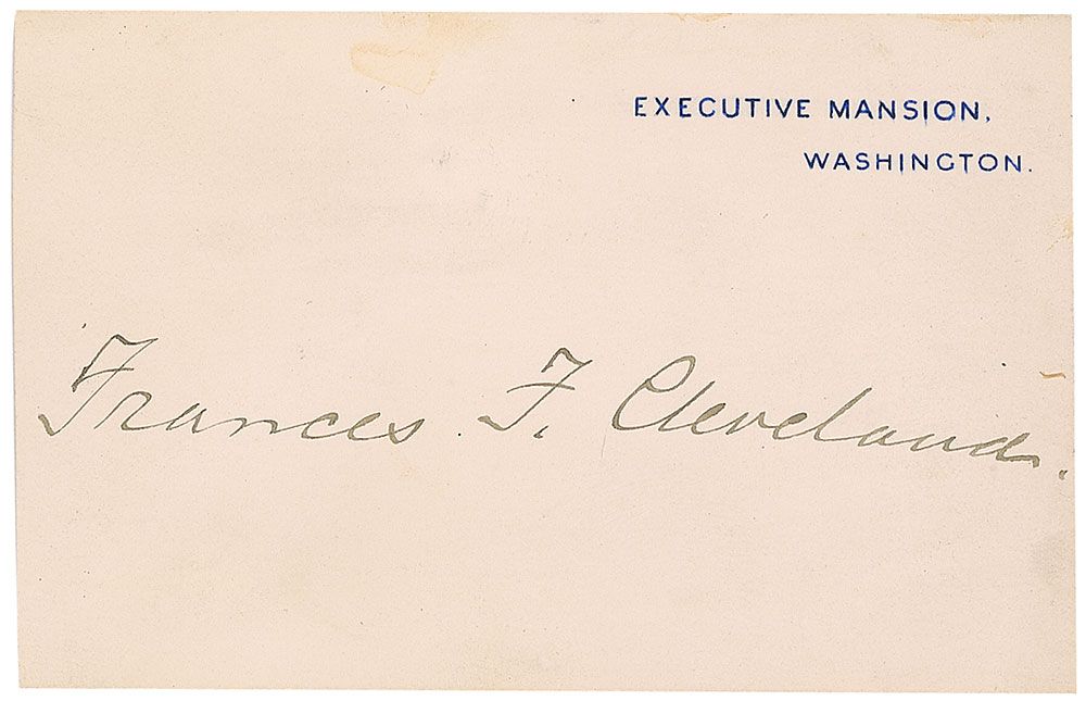 Executive Mansion card, 4 x 2.75, neatly signed in black ink, “Frances F. Cleveland.” Slight soiling to top and mounting remnants to reverse, otherwise fine condition.