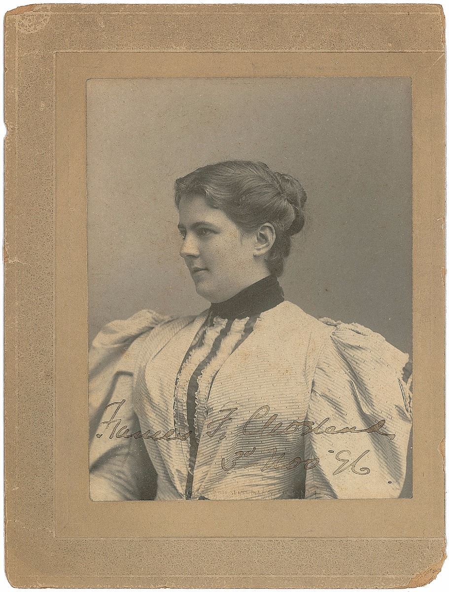 Nice 3.5 x 4.5 profile portrait of Cleveland in an ornate dress, signed below in black ink, “Frances F. Cleveland, 3’d Nov. 96.” Published by C. M. Bell of Washington, with a copyright blindstamp below the signature. In very good to fine condition, with wear to border and corner tips.