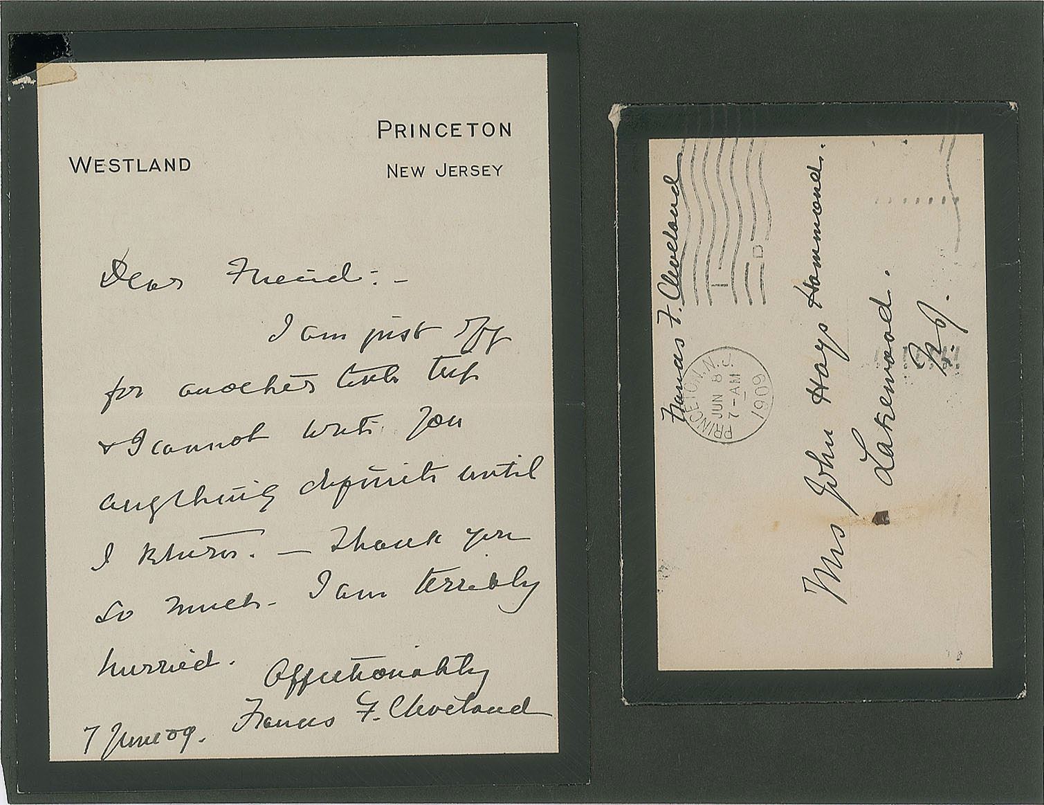 ALS signed “Frances F. Cleveland,” one page, 5 x 6.5, black-bordered Westland, Princeton mourning stationery, June 7, 1909. Letter to Mrs. John Hays Hammond, in part: "I am just off for another…trip & I cannot write you anything definite until I return.—Thank you so much. I am terribly hurried." Includes the original hand-addressed mailing envelope, which Cleveland has franked in the upper right; both the letter and envelope are affixed to an 8.75 x 6.75 sheet. In fine condition, with a piece of clear tape to the upper left corner.