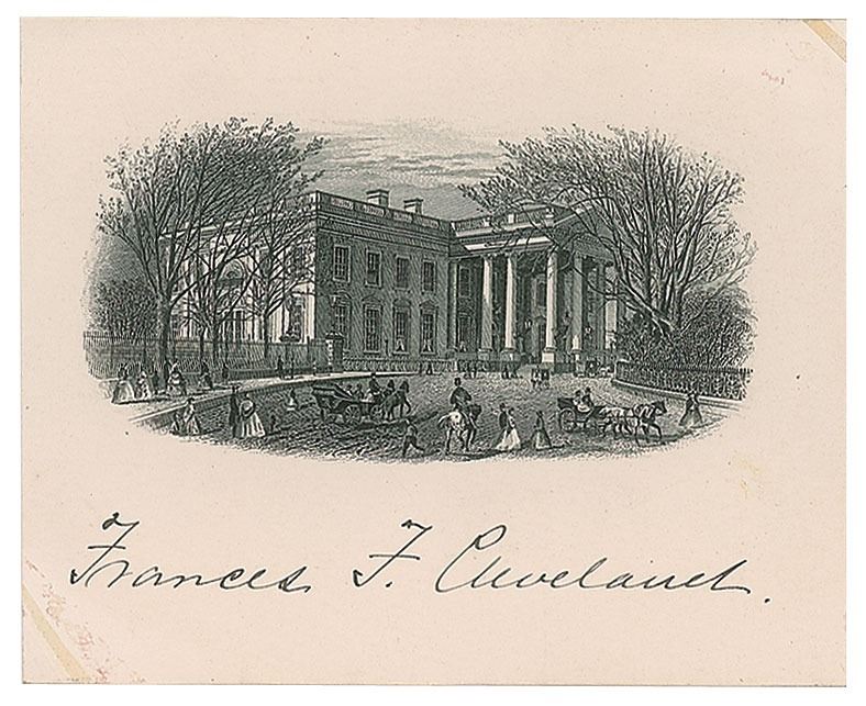 Uncommon engraving of the North Portico of the White House, 4.5 x 3.75, signed neatly in fountain pen, "Frances F. Cleveland." In fine condition, with small bits of mounting residue to two corners.