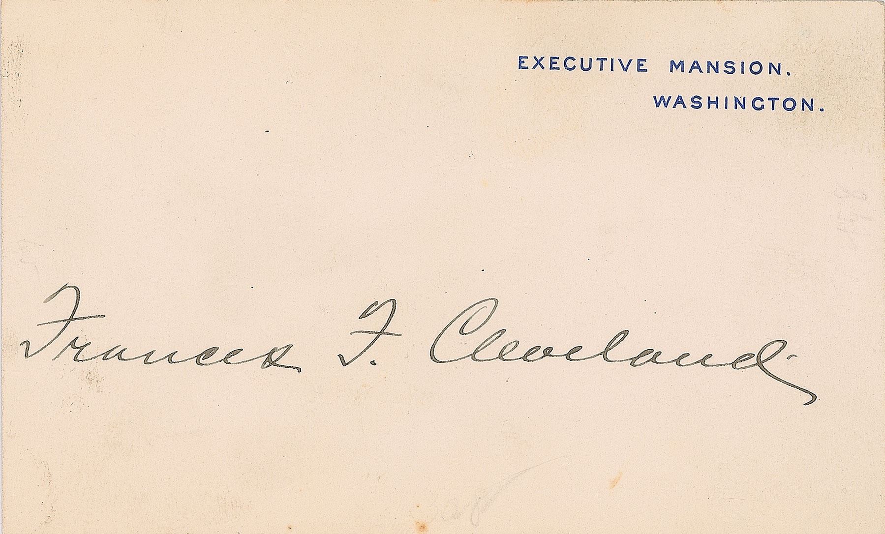 Official Executive Mansion card, neatly signed in ink by the first lady, "Frances F. Cleveland." In fine condition, with a bit of light soiling, and old mounting remnants on the back.
