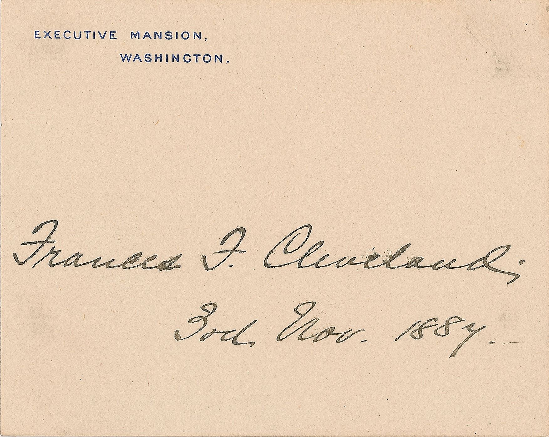 Large official Executive Mansion card, signed in ink, "Frances F. Cleveland, 3rd Nov. 1884." In fine condition, with some light soiling, and small corner stains to the reverse.