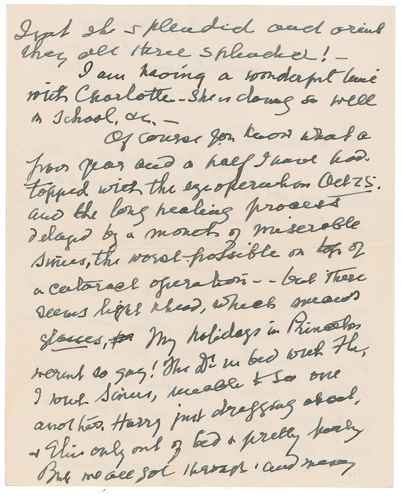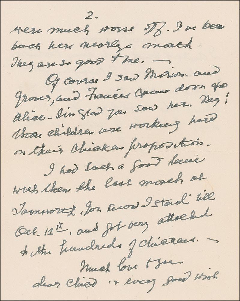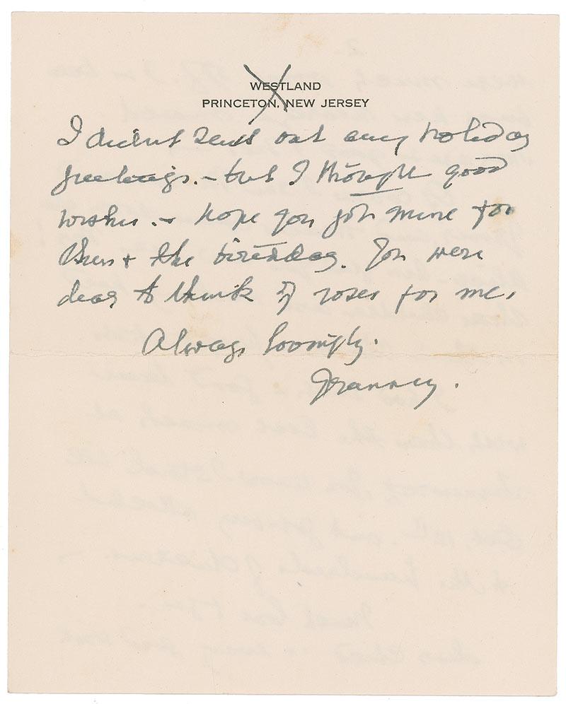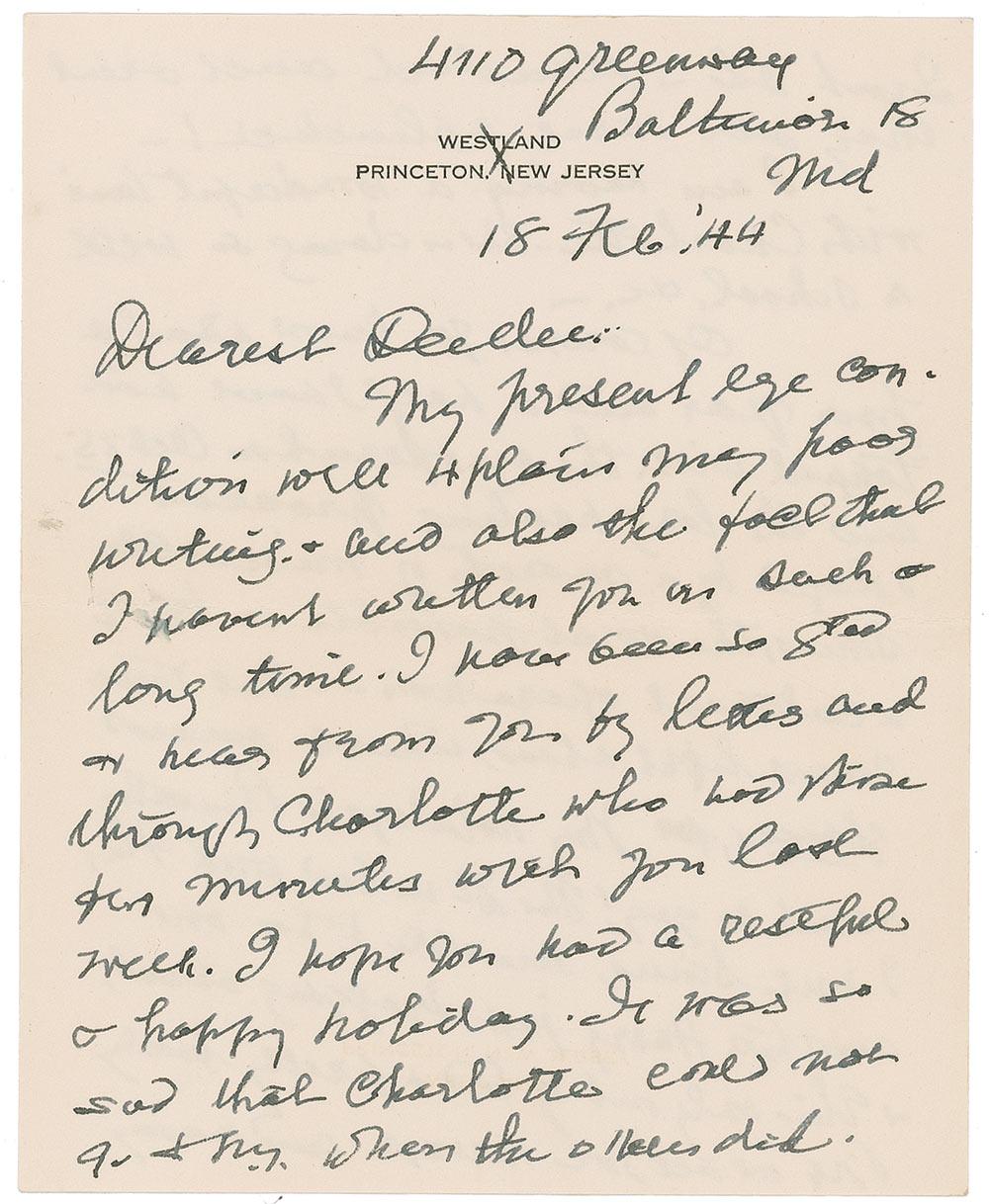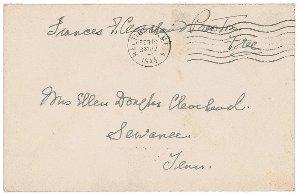 ALS signed “Granny,” two pages both sides, 5.5 x 7, February 18, 1944. Letter to Dee Dee Cleveland. In part: “My present eye condition will explain my poor writing & also the fact that I haven’t written you for such a long time…I hope you had a restful & happy holiday…Of course you know what a poor year and a half I have had, topped with the eye operation on Oct. 25 and the long healing process delayed by a month of miserable sinus, the worse possible on top of a cataract operation - but there seems light ahead, which means glasses…Of course I saw Marion, and Grover, and Francis…My! Those children are working hard on their chicken proposition. I had such a good time with them the last month…and got very attached to the hundreds of chickens.” In fine condition. Accompanied by the original mailing envelope, hand-addressed and free franked by Cleveland, “Frances F. Cleveland Preston Free.”