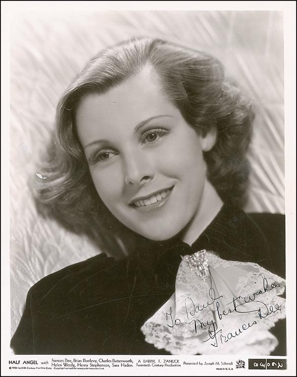 Actress (1909–2004) who starred in An American Tragedy and Little Women. Vintage glossy 8 x 10 20th Century Fox promotional photo for Half Angel, signed and inscribed in-person in fountain pen “To Saul, My best wishes, Frances Dee.” Reverse of photo bears collector’s ink date notation of June 23, 1945, the date the signature was acquired. In very good condition, with some scattered light creases and surface scratches, and mild silvering to darker areas of image. The Saul Goodman collection.