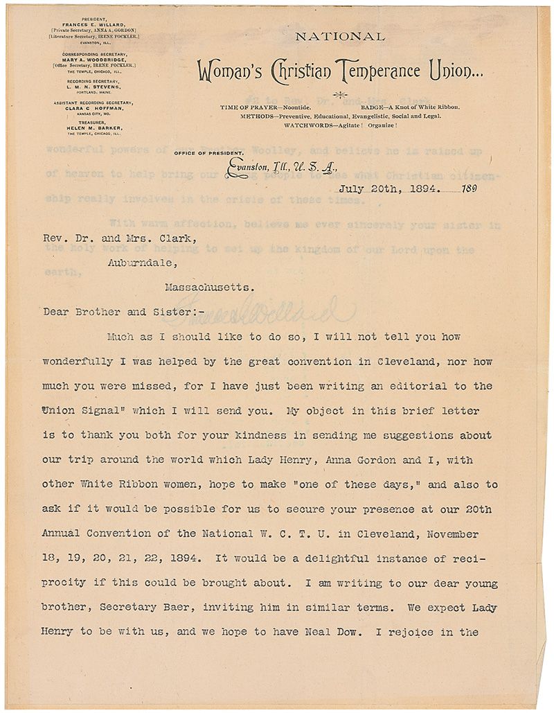 Christian temperance reformer and women’s suffragist (1839–1898), she was president of the Woman's Christian Temperance Union and influenced the adoption of the 18th and 19th Amendments. TLS, two pages, 8.25 x 11, Woman’s Christian Temperance Union letterhead, November 20, 1894. Letter to Rev. Francis E. Clark of the United Society of Christian Endeavor and his wife. In part: “My object in writing this brief letter is to thank you both for your kindness in sending me suggestions about our trip around the world which Lady Henry, Anna Gordon and I, with other White Ribbon women, hope to make ‘one of these days,’ and also to ask if it would be possible for us to secure your presence at our 20th Annual Convention of National W. C. T. U. in Cleveland…We expect Lady Henry to be with us, and we hope to have Neal Dow. I rejoice in the wonderful powers of our Brother Woolley, and believe he is raised up of heaven to help bring our young people to see what Christian citizenship really involves in the crisis of these times.” The two pages are affixed with glue along the top edge. In very good condition, with intersecting folds, and scattered wrinkles, creases, and toning.