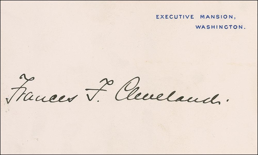 Signed Executive Mansion card, boldly signed in black ink, “Frances F. Cleveland.” In fine condition, with a bit of scattered light toning and soiling, and small area of mounting remnant on reverse.