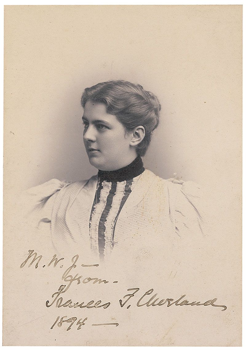 Original 4.25 x 5.75 cabinet bust portrait of Cleveland, signed and inscribed at the bottom of the image in black ink as first lady, “M. W. J.—From—Frances F. Cleveland, 1894.” Blindstamped at the bottom by C. M. Bell. In very good to fine condition, with irregularly trimmed edges, slight ink loss to a couple areas of the signature, and felt tip marks to reverse.