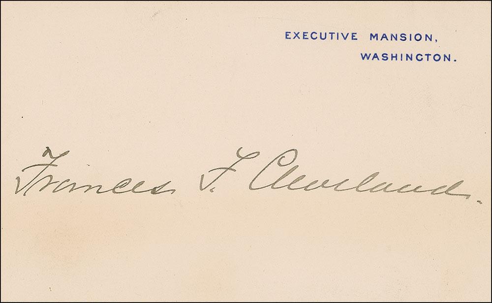 Signed Executive Mansion card, neatly signed in black ink, “Frances F. Cleveland.” In fine condition, with a mild shade of toning, and small notations on reverse. RRAuction COA.