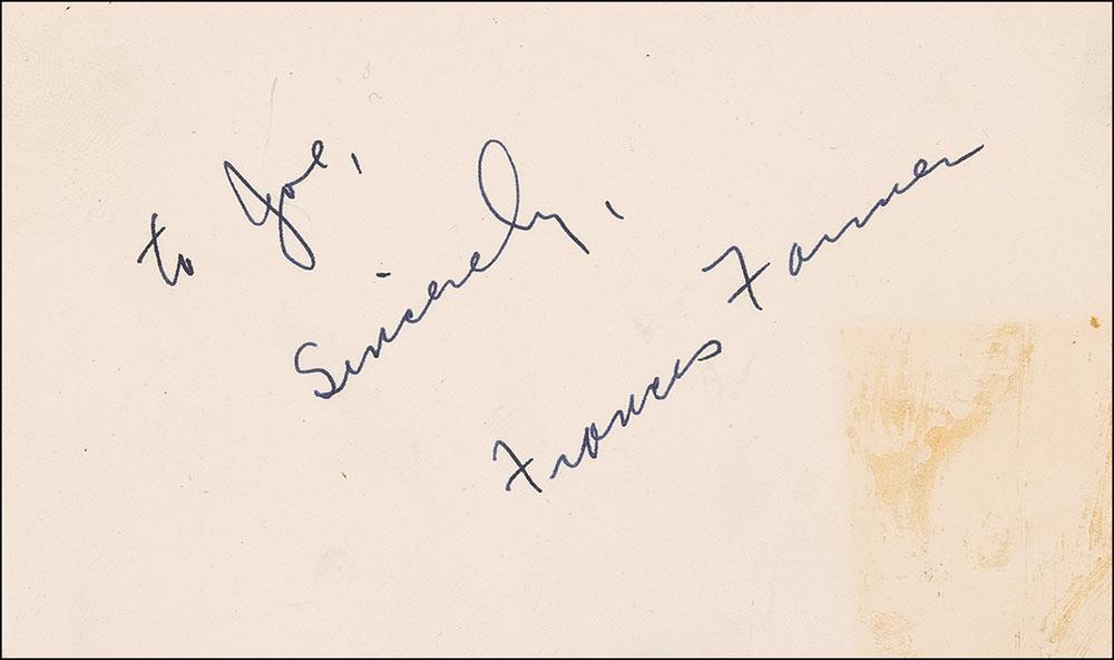 Promising American actress (1913–1970) whose career was cut short by alcoholism. She retired from films in 1942 and spent a large part of the remainder of her life in mental institutions, dying of cancer at 57. Vintage ink in-person signature and inscription, “To Joe, Sincerely, Frances Farmer,” on a 5 x 3 card. In fine condition, with small square of toning from a previously affixed clipped photo to lower right.
