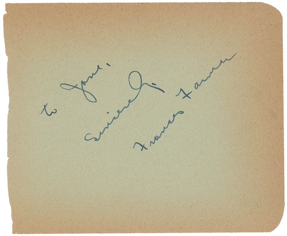 Vintage fountain pen signature and inscription, “To Jane, Sincerely, Frances Farmer,” on a light green 5.25 x 4.5 album page. Moderate toning working in from the borders, otherwise fine condition.