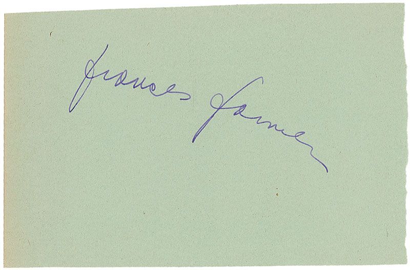 Promising American actress (1913–1970) whose career was cut short by alcoholism. She retired from films in 1942 and spent a large part of the remainder of her life in mental institutions, dying of cancer at 57. Vintage fountain pen signature, “Frances Farmer,” on a light green 5.5 x 3.5 album page. In fine condition.