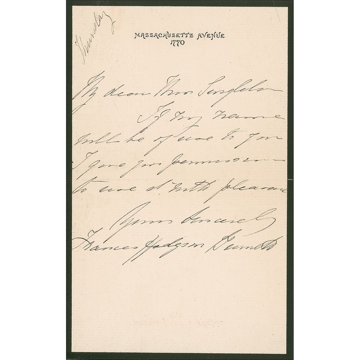 British author (1849–1924) of such children’s classics as The Secret Garden, Little Lord Fauntleroy, and A Little Princess. ALS, one page, 4.5 x 7, black-bordered Massachusetts Avenue letterhead, no date. In a letter to a friend, Burnett writes, in full: “If my name will be of use to you, I give you permission to use it with pleasure.” In fine condition, with a faint paperclip impression towards the top left edge. Accompanied by the original mailing envelope, addressed in Burnett’s hand.