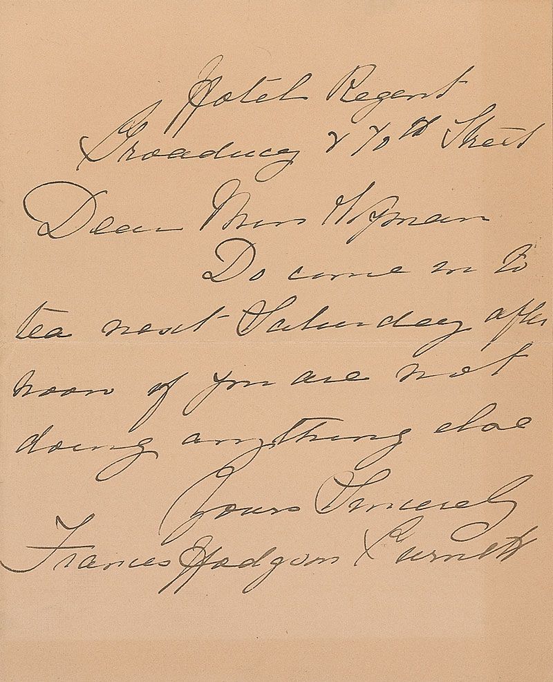 British author (1849–1924) of such children’s classics as The Secret Garden, Little Lord Fauntleroy, and A Little Princess. ALS, one page, 5 x 6.25, no date. Invitation to a friend. In full: “Do come to tea next Saturday after noon if you are not doing anything else.” Slight separation to right edge of central horizontal fold, and light toning to borders, otherwise fine condition.