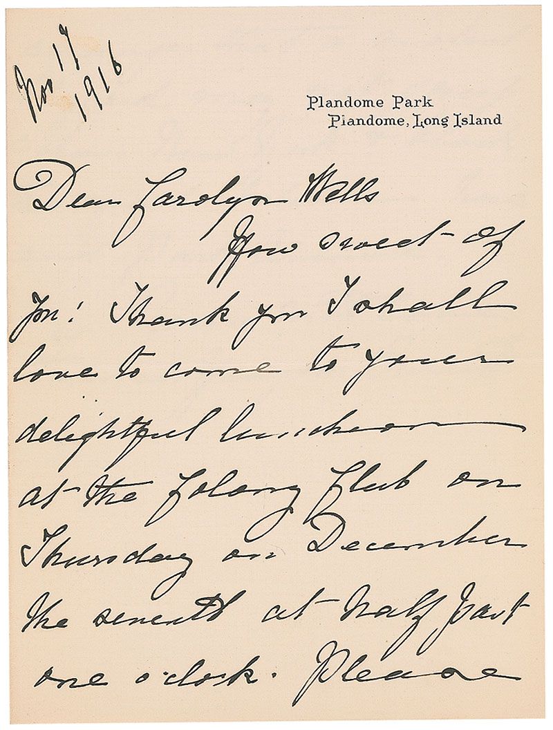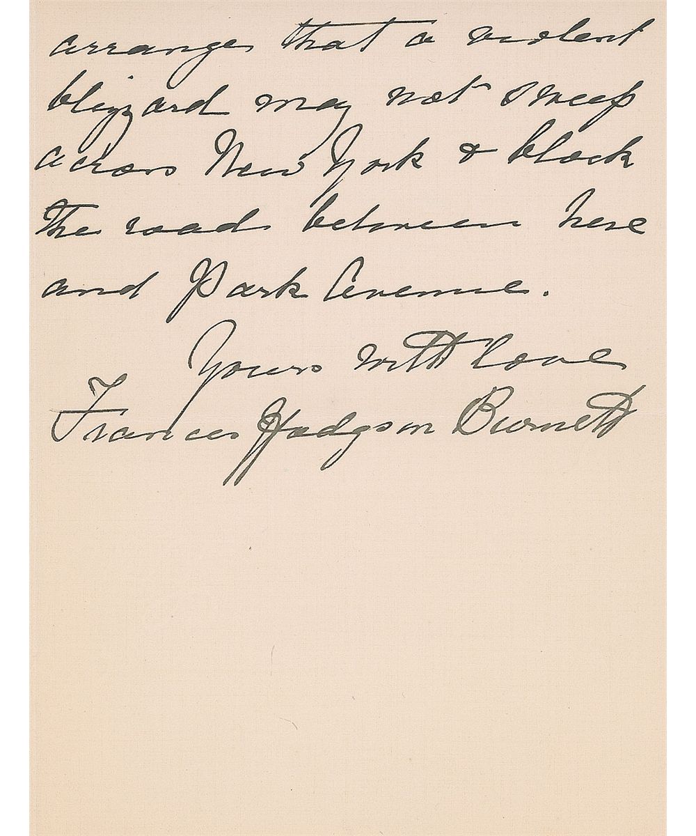 British author (1849–1924) of such children’s classics as The Secret Garden, Little Lord Fauntleroy, and A Little Princess. ALS, two pages on two adjoining sheets, 4.75 x 6.25, Plandome Park letterhead, November 17, 1916. Letter accepting a lunch invitation. In part: “I shall love to come to your delightful luncheon at the Colony Club…Please arrange that a violent blizzard may not sweep across New York & block the road between here and Park Avenue.” In fine condition.