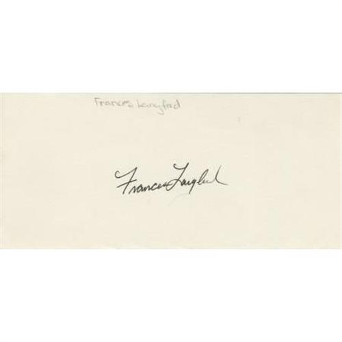<B>Frances Langford Autograph.</B></I> A 4" x 8" card signed by Frances Langford. The celebrated singer/entertainer autographed the card in black ink; her signature is large and clean. In Excellent condition though there is additional print along top border in pencil (in an unknown hand).<BR><BR><b>Shipping:</b> Flat Material, Small (<a target="_blank" href="http://www.heritageauctions.com/common/shipping.php">view shipping information</a>)