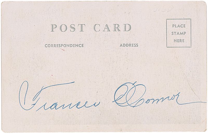 Circus performer (1914-1982) who was born without arms and known as the ‘Armless Wonder’ and ‘Living Venus de Milo.’ She performed various feats of dexterity with her feet, including eating, drinking, smoking cigarettes, and signing autographs. Vintage 3.5 x 5.5 postcard photo of O’Connor drinking with her foot, signed on the reverse in fountain pen. Scattered marks and corner creasing, otherwise fine condition.