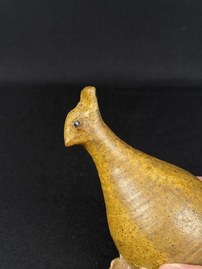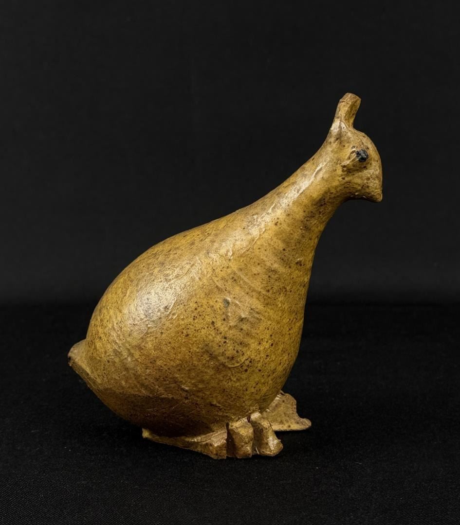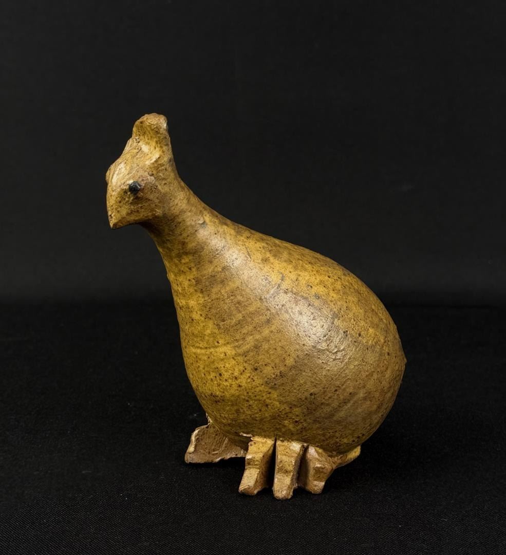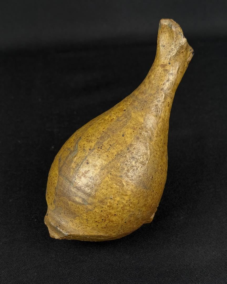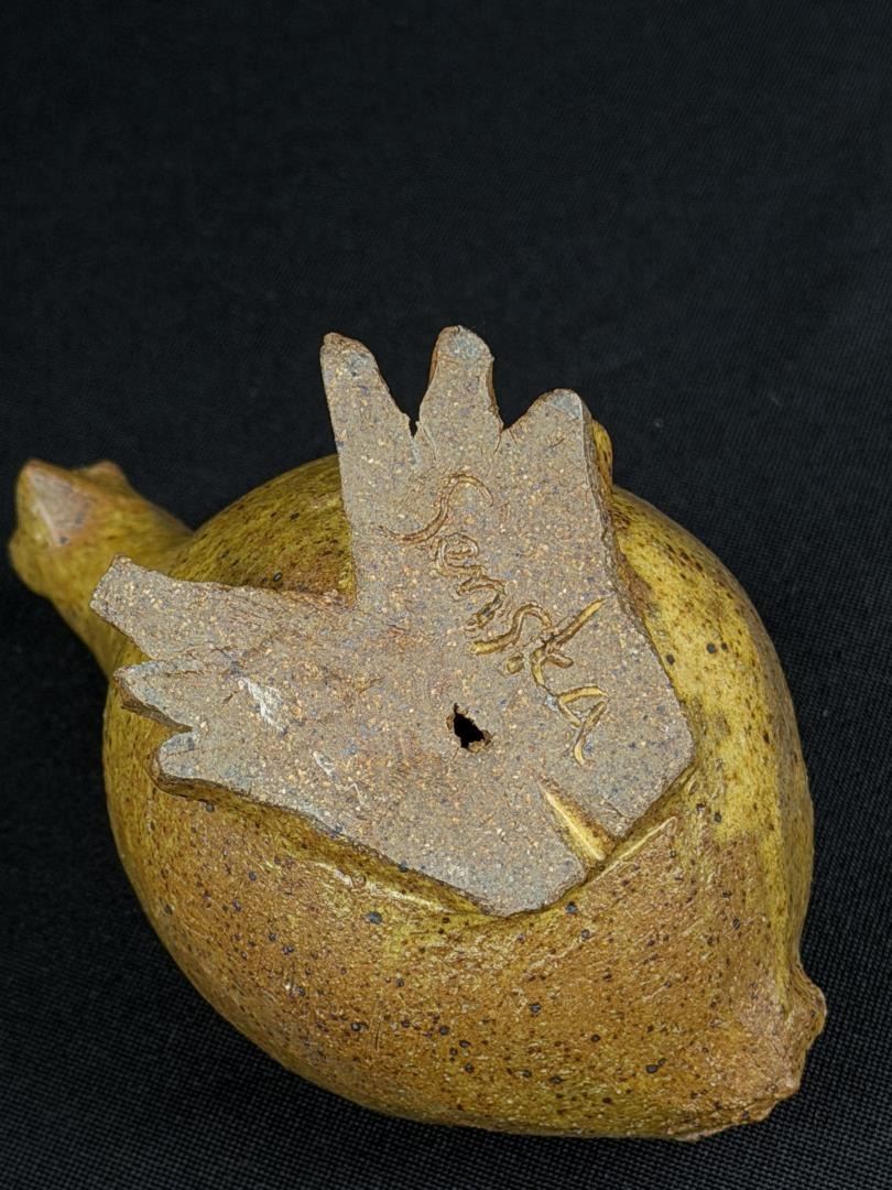 5" by 4 1/4" by 3 1/4". No damage. Frances Senska (1914 - 2009) was active/lived in Montana. Frances Senska is known for Pottery, ceramics, printmaker. Frances Maude Senska (March 9, 1914 – December 25, 2009) was an art professor and artist specializing in ceramics who taught at Montana State University – Bozeman from 1946 to 1973. She was known as the grandmother of ceramics in Montana. During her career, she trained a number of now internationally known ceramic artists. Senska was born in the port city of Batanga in the German Empire colony of Kamerun, (now Batanga, Cameroon). She was the only child of Frank Radcliff Senska and Georgia B. Senska, Presbyterian missionaries. Her father was a physician who founded Sakbayeme Hospital in the town of Sakbayeme in the highlands region of Bassa in Kamerun, her mother was a teacher who worked at the local missionary school. Frances was schooled at home; it took three days to walk to the nearest public school, and her parents felt this was too far away in case she fell ill with a tropical disease. She came to America for the first time in 1929. She graduated from University High School in Iowa City, Iowa. She earned a Bachelor of Arts and Master of Arts degree from the University of Iowa in 1935 and 1939, respectively. Her undergraduate training was in lithography, and her graduate degree in applied arts (specializing in sculpture.) She taught art at Grinnell College from 1939 to 1942. In the summer of 1941, she took art classes at the Chouinard Art Institute in Los Angeles, California. But in 1942, her teaching position at Grinnell was eliminated so that the college could hire a physics professor. That summer, she briefly studied ceramics under Laszlo Moholy-Nagy at the School of Design (now the IIT Institute of Design) in Chicago. Moholy-Nagy had a strong influence on Senska, influencing not only her ceramic design but her teaching style as well. She served in the United States Navy from 1942 to 1946 during World War II, where she was trained as a pilot. During her time in the military, she was posted to a base in San Francisco, California. She rose to the rank of lieutenant. She became interested in ceramics after taking a class from Edith Heath, then teaching at the California Labor School. In the summer of 1946, she attended the Cranbrook Academy of Art (now Cranbrook Educational Community), where she studied under Maija Grotell (one of the most important studio potters of mid-20th century America). She began teaching at Montana State University in Bozeman in 1946. The school's Department of Applied Art hired her to teach ceramics. But she did not, at that time, consider herself a ceramicist. "I started teaching ceramics with the merest little scrap of knowledge. I had had just two quarters of ceramics when I started teaching. I just learned it right along with the class," she later said. Senska decided to build a ceramics program from the ground up. Olga Ross Hannon, the department's head, gave her $300, and she and her first class of students took over a storeroom in the basement of Herrick Hall, purchased foot-driven potter's wheels, and built an electric kiln from scratch.[10] Continuing to train in ceramics, Senska attended a workshop taught by noted French-American ceramic artist Marguerite Wildenhain at the Pond Farm artists' colony near Guerneville, California, in the summer of 1950. Senska later said that she learned her hand technique from Wildenhain. Her students included a number of influential ceramicists, including Rudy Autio and Peter Voulkos. While teaching at Montana State, Senska met fellow art professor Jessie Spaulding Wilber. The two women became lifelong friends and companions. "We had a big thing in common -- childhoods with a lot of moving around," Frances said. "It was a great way to spend a childhood. Other kids had groups of friends and neighborhoods they grew up with, which is nice. On the other hand, it's real nice when you don't really feel you need to be part of a group." Senska retired from teaching in 1973. Wilber died October 2, 1989. Senska died on Christmas Day 2009 at her home in Bozeman, Montana.