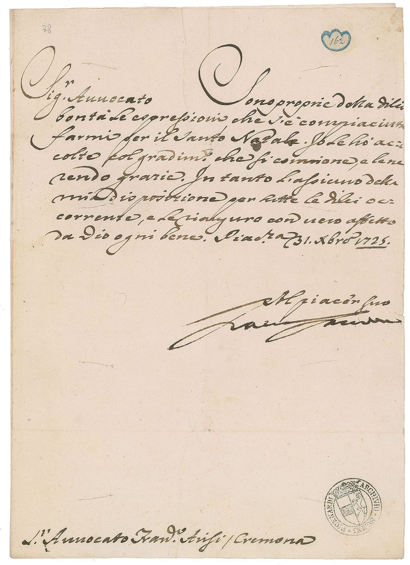 Seventh Farnese Duke of Parma and Piacenza (born 1678) from 1694 until his death in 1727. Untranslated ALS in Italian, one page, 8.25 x 11.25, October 31, 1725. Reverse of second integral page bears the original paper seal. In fine condition, with intersecting folds.
