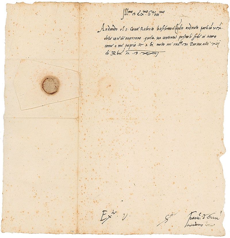 Italian statesman (1483–1540) considered one of the major political writers of the Italian Renaissance. Manuscript DS, in Italian, one page, 7.75 x 12.25, December 12, 1526. A letter of recommendation for count Ruberto Boschetto, signed in the lower right corner by Guicciardini. Central horizontal and vertical folds, scattered light foxing (primarily to left side), and a red wax and paper seal affixed to reverse, otherwise fine condition. Only two Guicciardini letters have sold at auction in the past 35 years—this is the first we have offered!