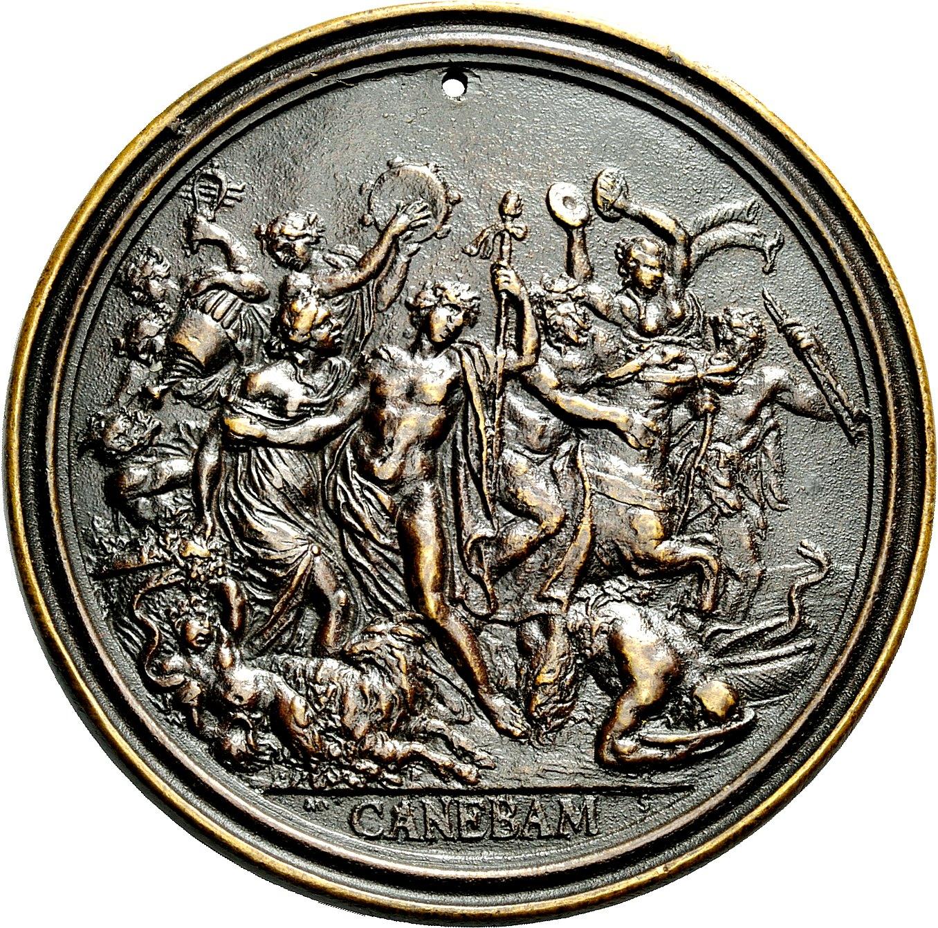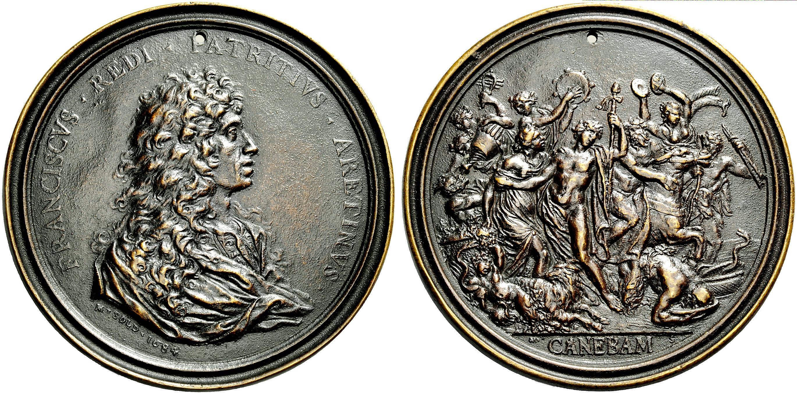 Medaglie e placchette. Francesco Redi scienziato e poeta alla corte medicea 1626-1697. Medaglia 1684. per omaggio del Granduca Cosimo III (opus: Massimiliano Soldani), fusione in bronzo 188,27g. Ø 88 mm. FRANCISCVS REDI PATRITIVS ARETINVS Busto drappeggiato a d.; sotto, M. SOLD 1684. Rv. Il trionfo di Bacco; all’esergo, CANEBAM. Vannel Toderi Medaglia barocca in Toscana 36. Molto rara. Fusione originale con foro di sospensione. Intrigante rappresentazione al rv., buon BB / q.Spl