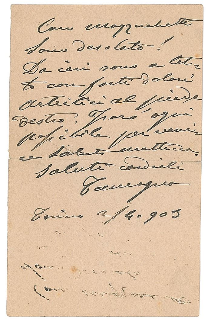 World-renowned Italian operatic tenor (1850–1905) who sang Otello in the first performance of Giuseppe Verdi's opera. Untranslated ALS in Italian, signed “Tamagno,” one page, 4.25 x 7, no date. In fine condition, with a short split to the end of the central horizontal fold. Accompanied by an unsigned mounted portrait of the tenor.