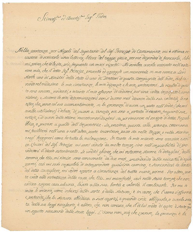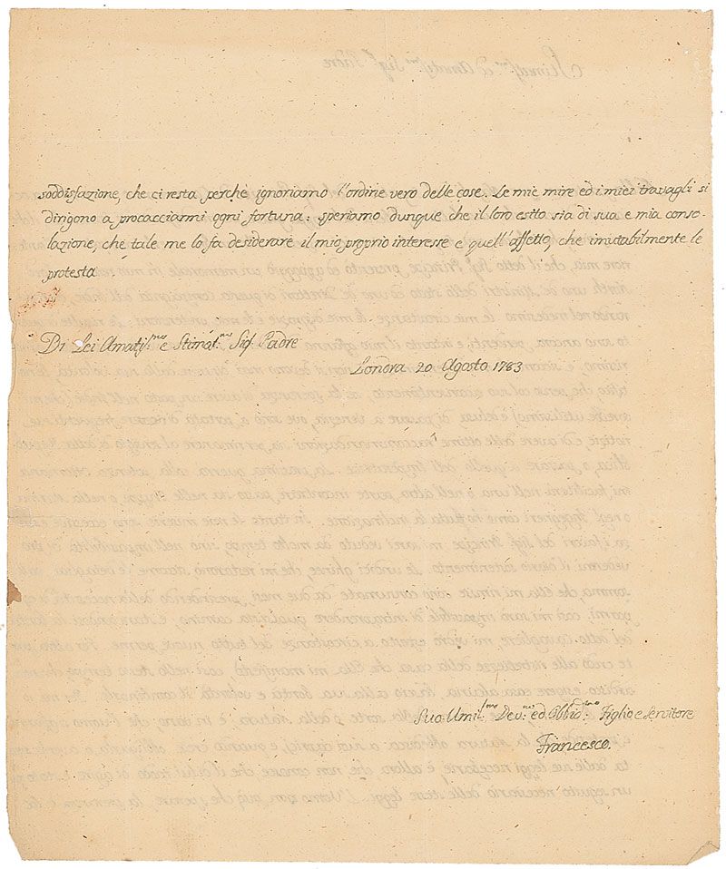 Pioneer Italian aviator (1752–1812) who dedicated himself to balloon flight. Rare ALS in Italian, signed “Francesco,” one page both sides, 7.25 x 9, London, September 20, 1783. A lengthy letter to his father on his hopes to get a military commission in England. In fine condition, with intersecting folds and a trivial puncture to right side (barely affecting two words).