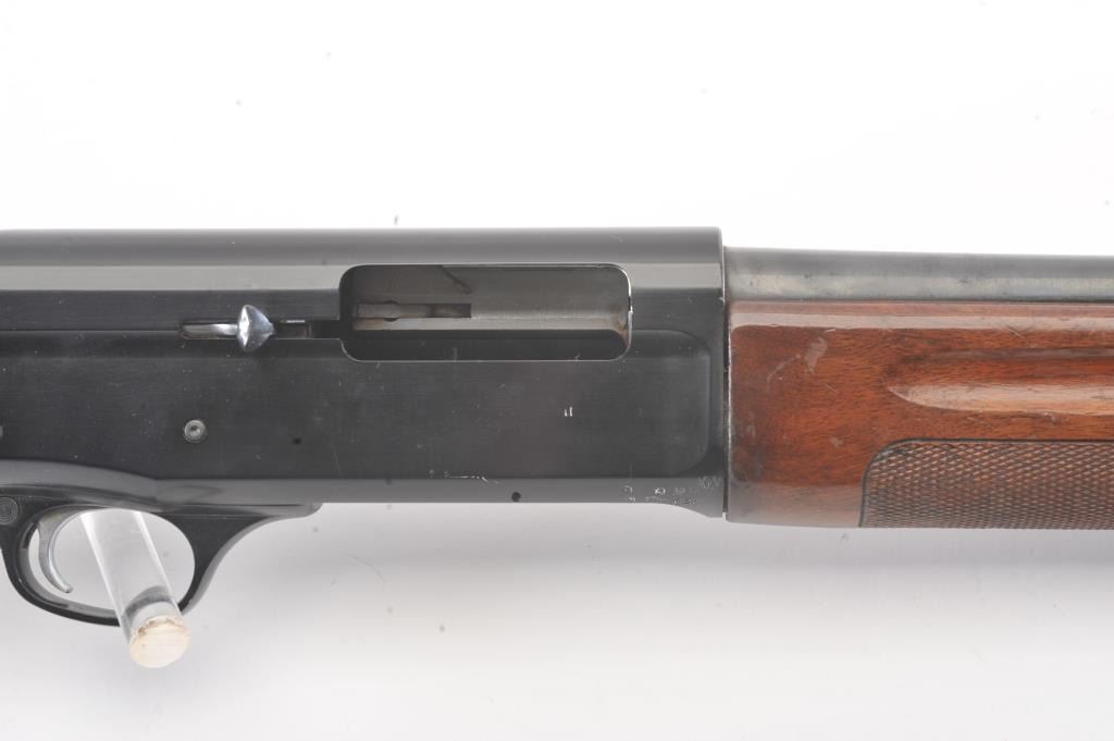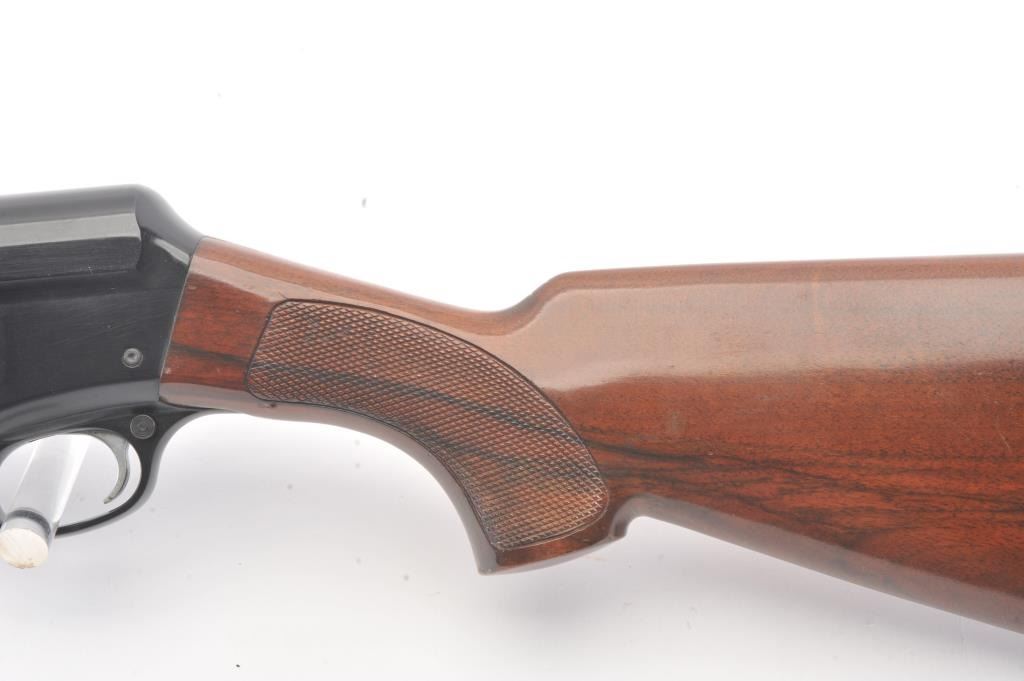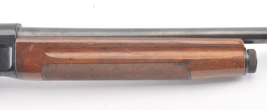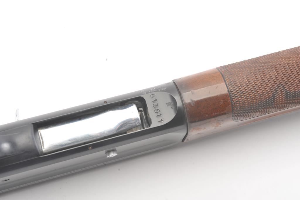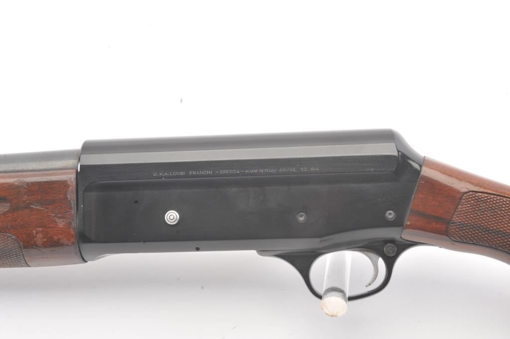 Franchi Model 48AL semi-automatic shotgun, 12 gauge, Serial #B13511. The shotgun is in very good to nearly fine overall condition with a 30” barrel with a ramped blade rifle sight. The shotgun retains nearly all of the blue finish with small mars, scratches and numerous proofs on the underside of the receiver. The checkered wood stock is in very good condition with dents and compressions consistent with field use. Thebore is good, the action is crisp and the markings are sharp. Est.: $300-$600. (Modern).