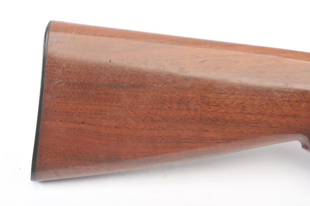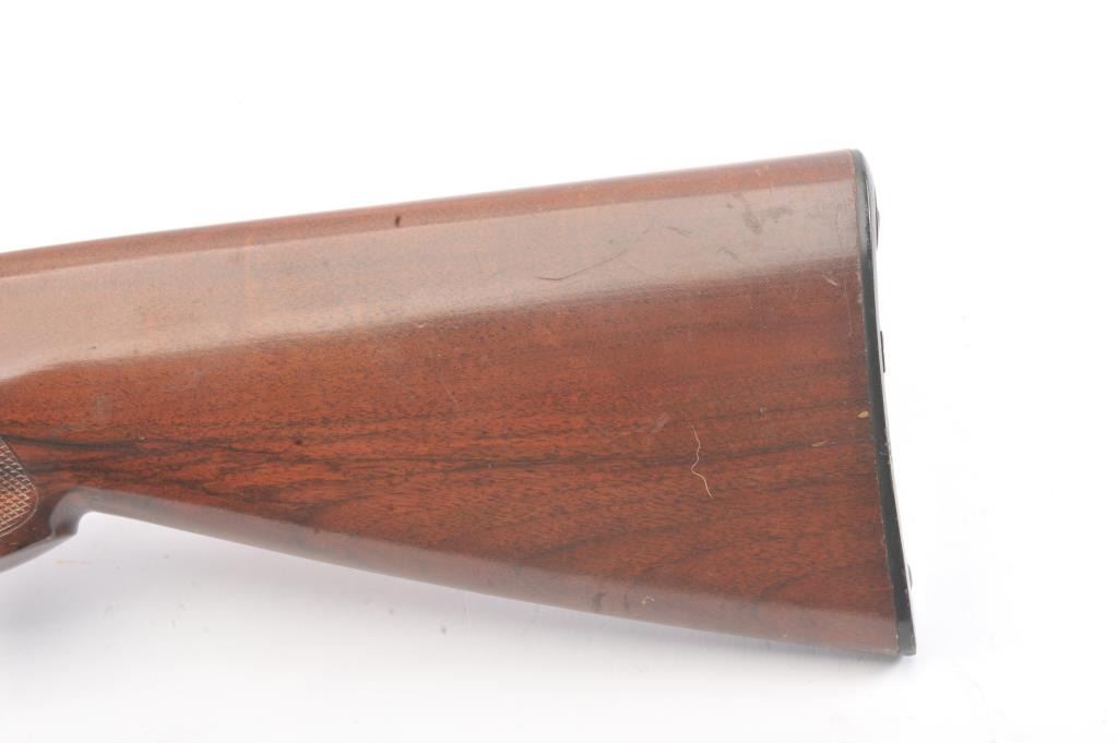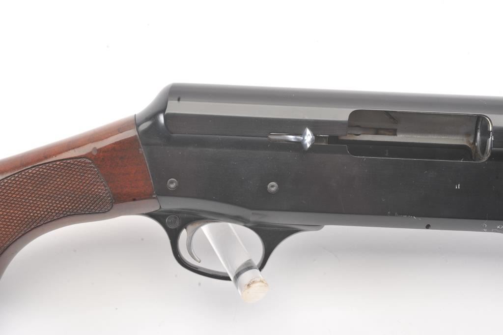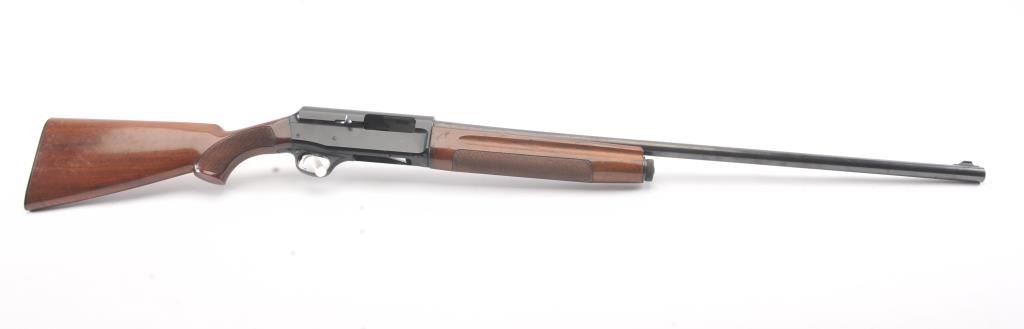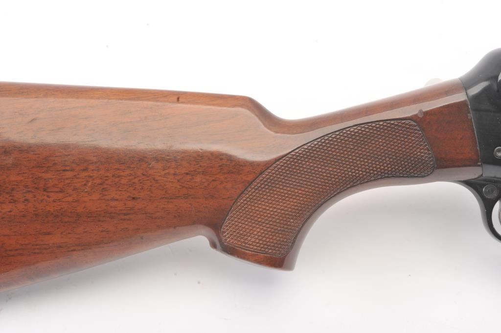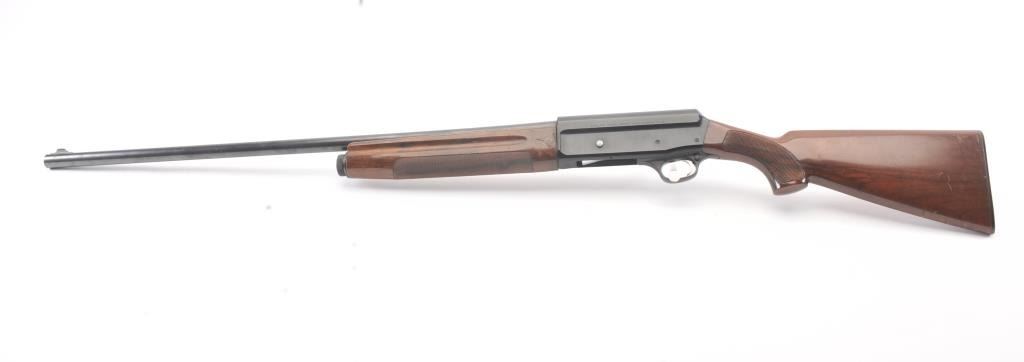 Franchi Model 48AL semi-automatic shotgun, 12 gauge, Serial #B13511. The shotgun is in very good to nearly fine overall condition with a 30” barrel with a ramped blade rifle sight. The shotgun retains nearly all of the blue finish with small mars, scratches and numerous proofs on the underside of the receiver. The checkered wood stock is in very good condition with dents and compressions consistent with field use. Thebore is good, the action is crisp and the markings are sharp. Est.: $300-$600. (Modern).