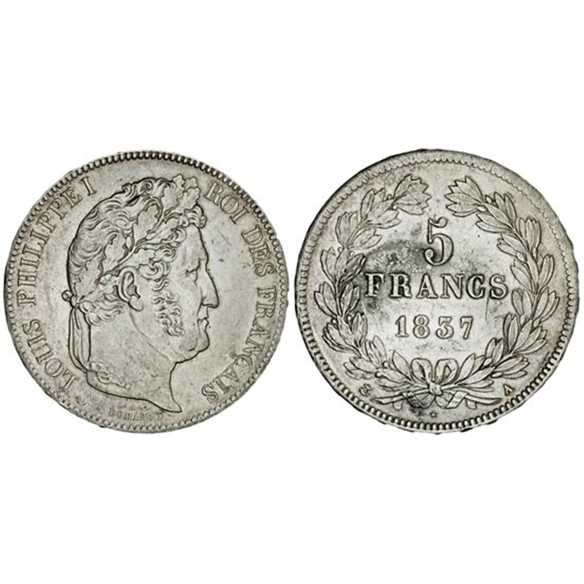 Francia. Luis Felipe. 5 francos. 1837. París. A. Dos golpecitos en el canto y pequeña oxidación en el reverso. KM-794.1. Ar. EBC-.