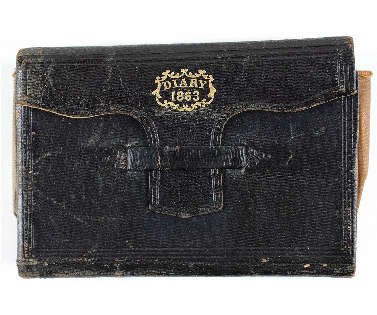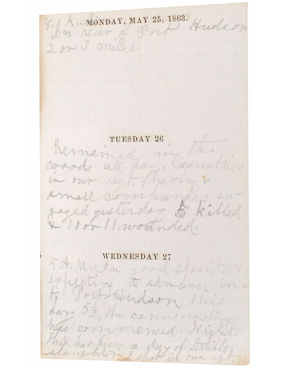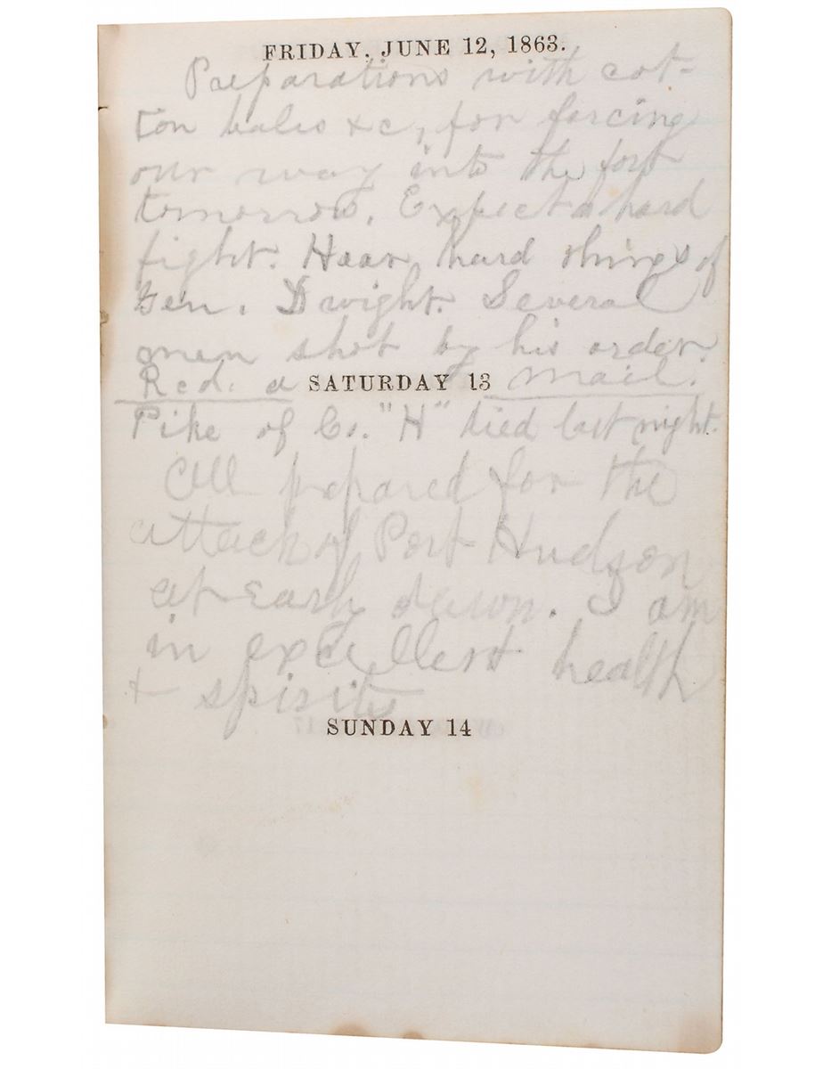 Personal leatherbound 1863 diary of Sgt. Francis A. Clary, 2.5 x 4, signed on the first page in ink, “F. A. Clary.” The diary contains terse entries penned almost daily from January 1 through April 13, and May 24 through June 13, the day before Clary was killed in action at the Battle of Port Hudson. The diary begins in a calm state, the entry of January 1 reading, “Mild & balmy are these Southern skies…Read’g ‘Nicholas Nickelby.’” By the middle of the month things had changed, with Clary writing on the 16th and 17th, “Is bitter cold, with a piercing merciless wind…All preparing to leave for action up the river.” After a “narrow escape from a boiler explosion,” Clary describes a Sunday in mid-February, “Had a miserable drill. Came in on the ‘double quick.’ Sacred time seems to be of little acct. now!” On March 13, he writes, “We commence our Grand Expedition toward Port Hudson.” The next day, “Marched 7 miles last night, & 10 more to day. Are now about 5 m. fr. Port Hudson…Hear the firing at Port Hudson distinctly. Occupy ground just deserted by the rebels.” On April 12, “Moved up a short distance from Pattersonville. Shelled a post of rebel cavalry & at 5 P.M. engaged a rebel battery. Fight lasted 35 min. Were driven back. A piece of shell struck only 2 ft. fr. me.” The fiercest fighting begins on May 27, “The cannonading has commenced…This has been a day of terrible slaughter. 2 shot in our regt.” On May 28, he gravely observes, “Dead and wounded are counted by hundreds.” On the 30th, he writes, “Several narrow escapes from the heavy guns of the enemy tearing down trees.” His last entry comes on June 13, “All prepared for the attack of Port Hudson at early dawn. I am in excellent health & spirits.” A pocket in the pack of the diary contains several clippings of inspirational texts. Also includes two full-length carte-de-visite portraits of Clary, one in a small frame, as well as a newspaper clipping mentioning his death. In overall fine condition. An outstanding firsthand account of a soldier’s journey during the Civil War.