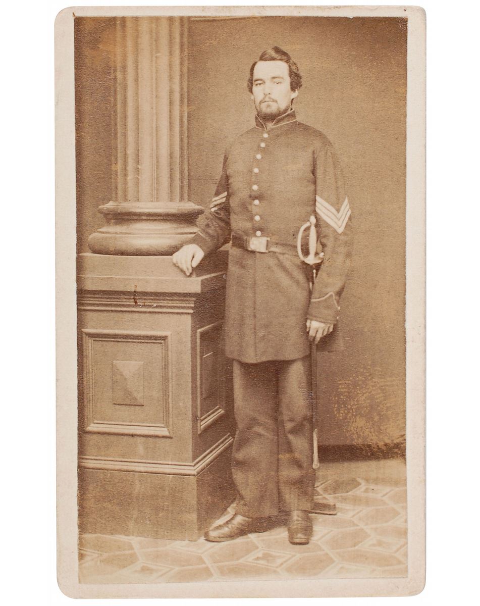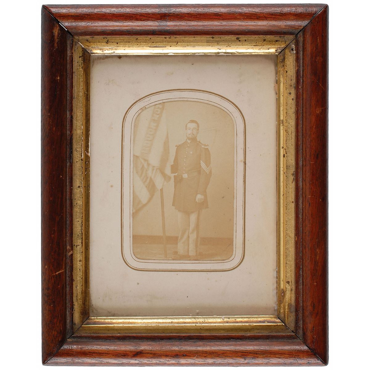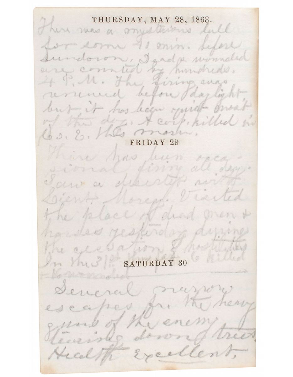 Personal leatherbound 1863 diary of Sgt. Francis A. Clary, 2.5 x 4, signed on the first page in ink, “F. A. Clary.” The diary contains terse entries penned almost daily from January 1 through April 13, and May 24 through June 13, the day before Clary was killed in action at the Battle of Port Hudson. The diary begins in a calm state, the entry of January 1 reading, “Mild & balmy are these Southern skies…Read’g ‘Nicholas Nickelby.’” By the middle of the month things had changed, with Clary writing on the 16th and 17th, “Is bitter cold, with a piercing merciless wind…All preparing to leave for action up the river.” After a “narrow escape from a boiler explosion,” Clary describes a Sunday in mid-February, “Had a miserable drill. Came in on the ‘double quick.’ Sacred time seems to be of little acct. now!” On March 13, he writes, “We commence our Grand Expedition toward Port Hudson.” The next day, “Marched 7 miles last night, & 10 more to day. Are now about 5 m. fr. Port Hudson…Hear the firing at Port Hudson distinctly. Occupy ground just deserted by the rebels.” On April 12, “Moved up a short distance from Pattersonville. Shelled a post of rebel cavalry & at 5 P.M. engaged a rebel battery. Fight lasted 35 min. Were driven back. A piece of shell struck only 2 ft. fr. me.” The fiercest fighting begins on May 27, “The cannonading has commenced…This has been a day of terrible slaughter. 2 shot in our regt.” On May 28, he gravely observes, “Dead and wounded are counted by hundreds.” On the 30th, he writes, “Several narrow escapes from the heavy guns of the enemy tearing down trees.” His last entry comes on June 13, “All prepared for the attack of Port Hudson at early dawn. I am in excellent health & spirits.” A pocket in the pack of the diary contains several clippings of inspirational texts. Also includes two full-length carte-de-visite portraits of Clary, one in a small frame, as well as a newspaper clipping mentioning his death. In overall fine condition. An outstanding firsthand account of a soldier’s journey during the Civil War.