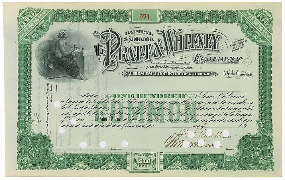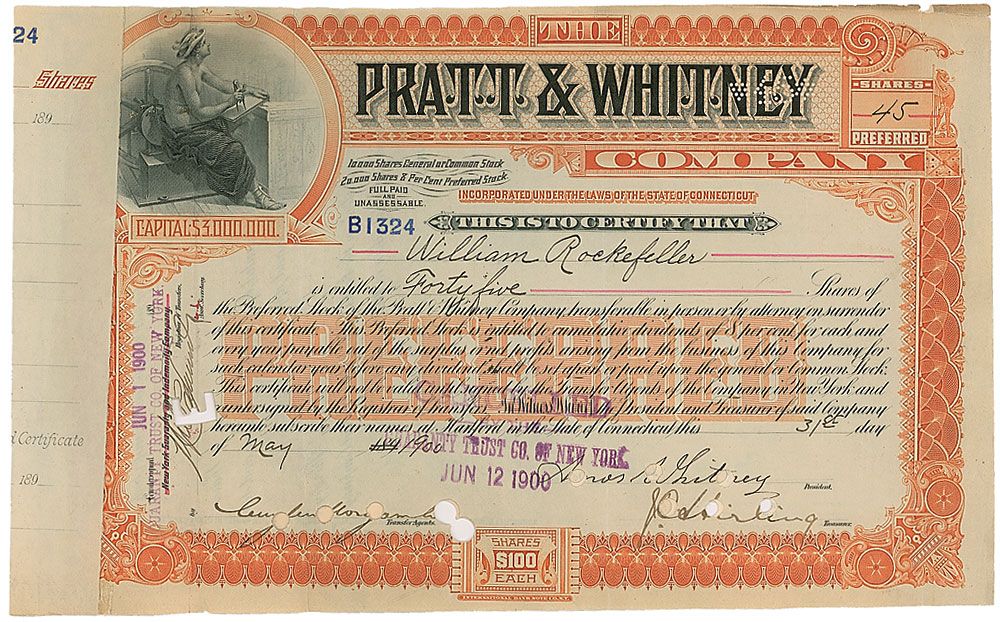 Engineers and inventors who organized the Pratt & Whitney company to manufacture machine tools, tools for the makers of sewing machines, and gun making machinery for use by the Union Army during the American Civil War. Two stock certificates: partly-printed DS, signed “F. A. Pratt,” one page, 11.25 x 7, no date but circa 1890s. Unissued and canceled stock certificate for the Pratt & Whitney Company, signed by Pratt as president of the company; and a partly-printed DS, signed “Amos C. Whitney,” one page, 11 x 6.75, May 31, 1900. Stock certificate issued to William Rockefeller for 45 shares of stock of the Pratt & Whitney Company; the receipt and a related letter are affixed to the reverse. Signed at the conclusion by Whitney as president of the company. In overall very good condition, with expected document wear and cancellation holes significantly affecting the signatures.
