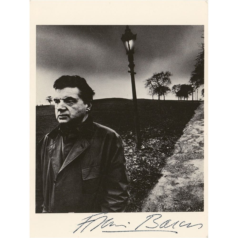 Semi-glossy 4.25 x 6 postcard of Bill Brandt's photograph of Francis Bacon walking on London's Primrose Hill in 1963, signed in the lower border in black ink by Bacon. In very fine condition.