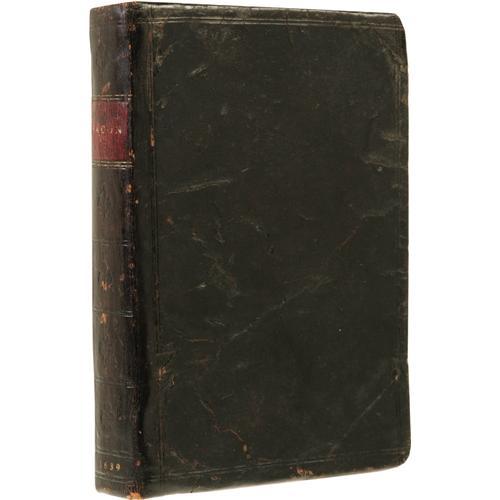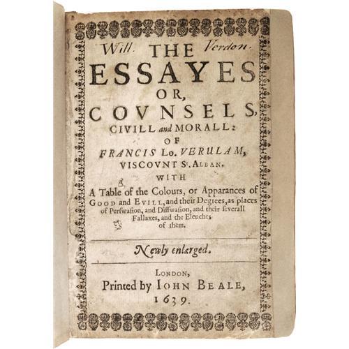 <B>Francis Bacon:<I> The Essayes or, Councels, Civil and Moral: Of Francis Lo. Verulam, Viscount St. Alban. With A Table of the Colours, or Apparances of Good and Evill, and Their Degrees, as places of Perswasion, and Disswasion, and Their severall Fallaxes, and the Elenches of them.</B></I></B></I> (London: John Beale, 1639) A3 + 340 pages, "Newly enlarged" edition (i.e. the 4th), 12mo (5.25" x 7.25"), full calf. Simple ornaments frame the title page; woodcut initials and headpieces. Text is printed within rules, leaving space for the reader to add her own marginalia. Wear to pages, but firm binding. Very good condition.<BR><BR><b>Shipping:</b> Books & Catalogs (<a target="_blank" href="http://www.heritageauctions.com/common/shipping.php">view shipping information</a>)
