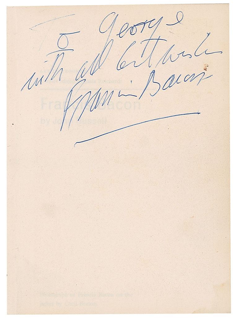 Signed book: Francis Bacon by John Russell. First edition. London: Methuen & Co., 1964. Hardcover with dust jacket, 5.5 x 7.5. Signed and inscribed on the first free end page in black ballpoint, "To George, with all best wishes, Francis Bacon." In fine condition.