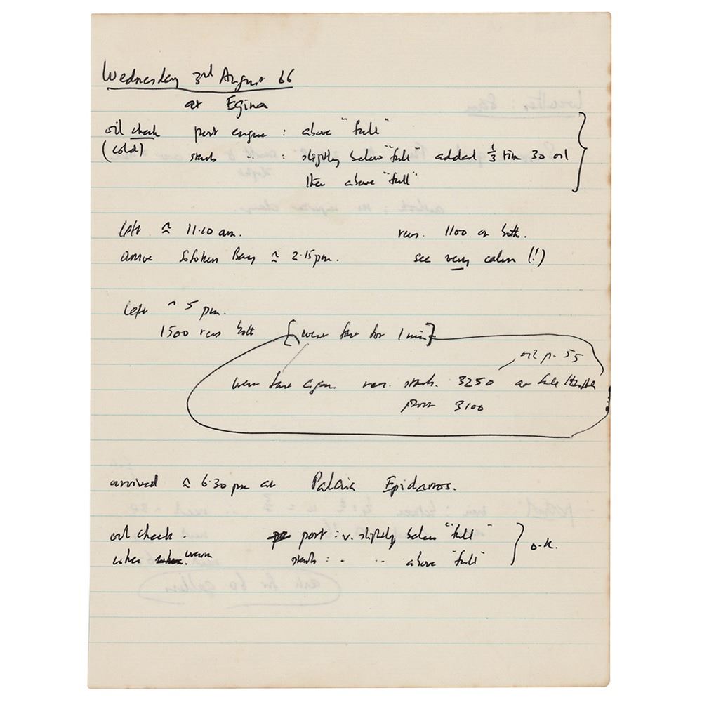 Unsigned handwritten notes by Francis Crick, one page both sides, 6.75 x 9, dated August 3, 1966, from Crick’s nautical logbook used onboard his Bertram powerboat named the Eye of Heaven. The notes document his travels around Greece, noting times of arrival and departure, and tracking his fuel and oil levels. Among the destinations listed are "Egina," "Palaia Epidavros," and "Saronic Gulf." "Aegean," "Poros," and "Hydra." He makes some minor observations on the conditions, for example, "very calm (!)." In monitoring his fuel usage, he writes some fractions and does addition to determine how much he needs ("between 1/4 + 1/2 = 3/8 = need ~38…read = 16 need ~24, need ~62, ask for 60 gallons"). In fine condition. These notes date to just four years after Crick received the Nobel Prize for his discovery of DNA.